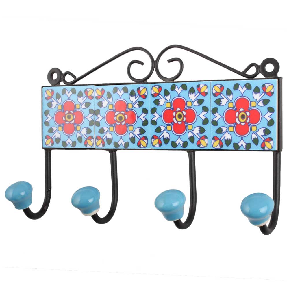 Turquoise Red Floral Tiles Hook. When Put on Wall or Cabinet It is An Art in Itself. the Metal Part of This Hook is Black Powder Coated.