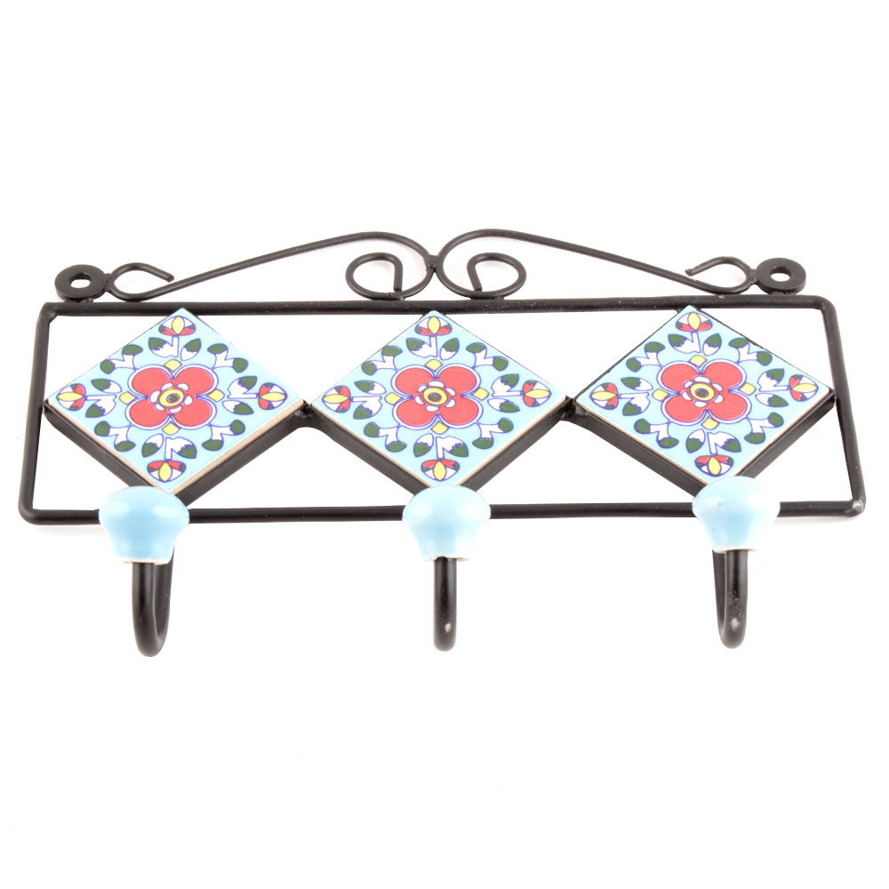 Turquoise Red Floral Tiles Hooks.When Put on Wall or Cabinet it is an Art in itself. The Metal Part of this Hook is Black Powder Coated.