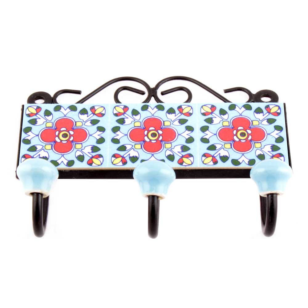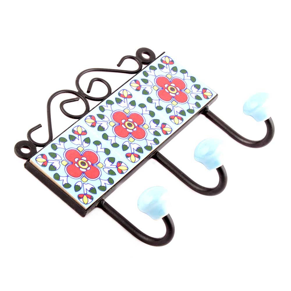 Turquoise Red Floral Tiles Hooks. WhenPut on Wall or Cabinet it is an Art in itself. The Metal Part of this Hook is Black Powder Coated.