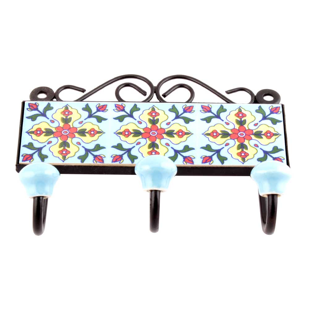 Turquoise Red Tiny Flower Tiles Hooks. WhenPut on Wall or Cabinet it is an Art in itself. The Metal Part of this Hook is Black Powder Coated.