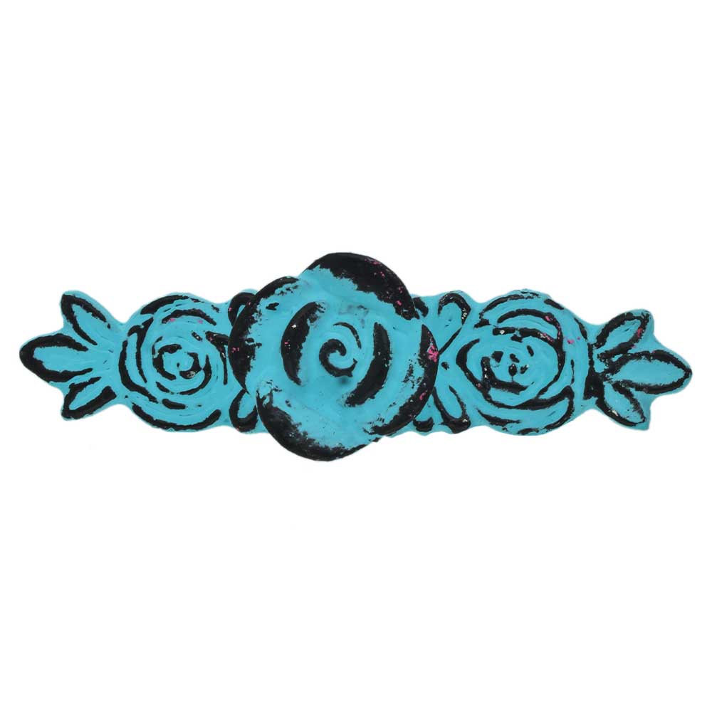 The intricate turquoise rose design on each pull offers a bold contrast against the distressed iron finish, giving it a unique, weathered look that adds character to your furniture. The combination of vibrant color and industrial-style metal work creates an eclectic, eye-catching look that will instantly elevate the style of any cabinet, drawer, or piece of furniture.