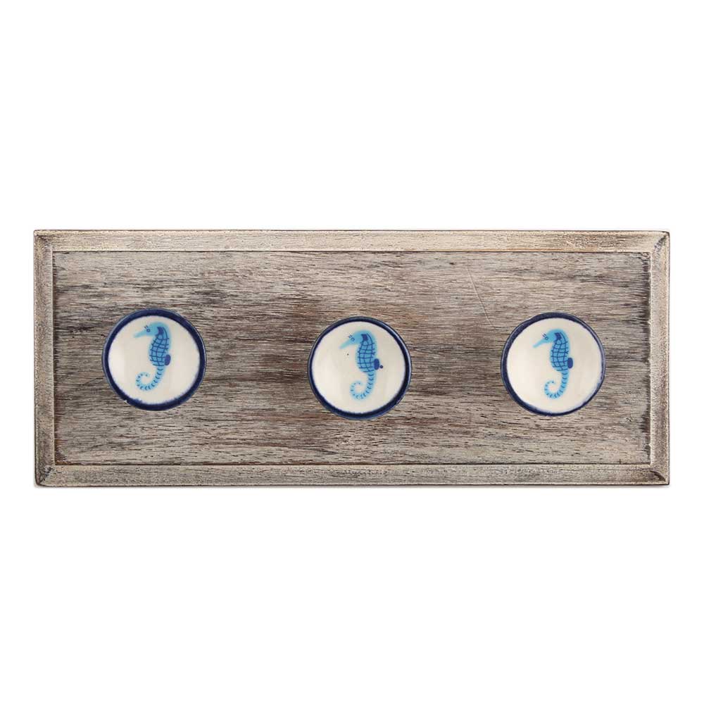 Turquoise Seahorse Flat Ceramic Wooden Hook. A Perfect Complement to the Soft Tone of the Wood are these White Traditional Hat & Coat Hook Made of Genuine Porcelain and Brass. It can be use to Hang Jewellery, Leashes, Towels, Scarves, Light Weight Sweaters, Caps Etc.