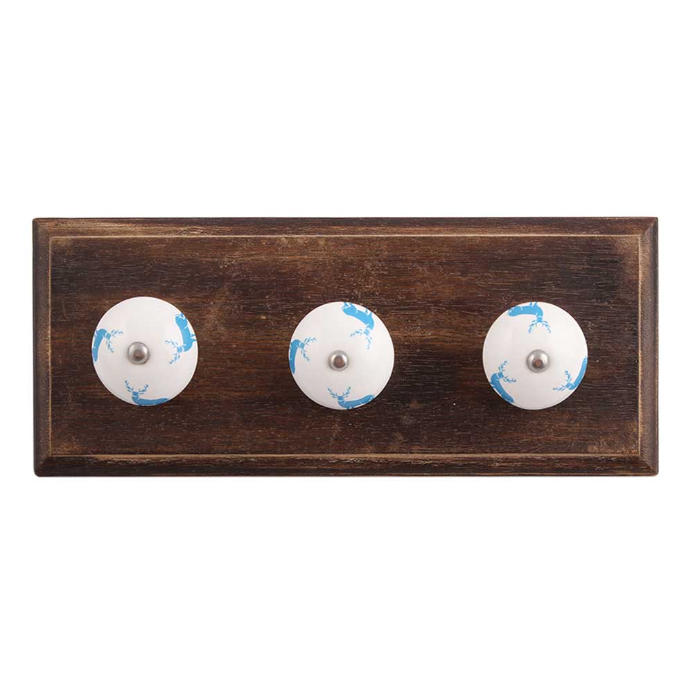 Turquoise Standing Rein Deer Pattern Ceramic Wooden Hook. A Perfect Complement to the Soft Tone of the Wood are these White Traditional Hat & Coat Hook Made of Genuine Porcelain and Brass. It can be use to Hang Jewellery, Leashes, Towels, Scarves, Light Weight Sweaters, Caps Etc.
