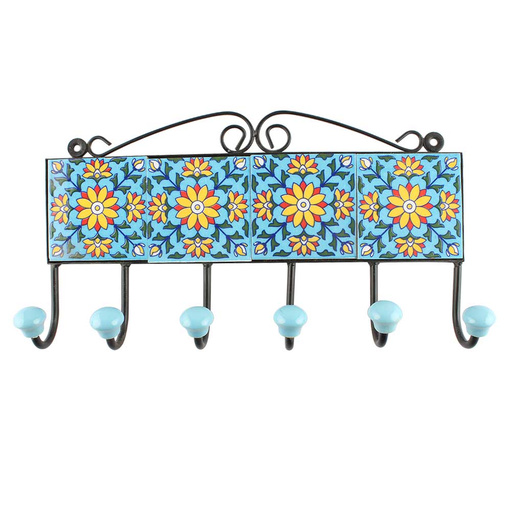 Turquoise Sunflower Ceramic Tiles Hook Online. When Put on Wall or Cabinet It is An Art in Itself. The Metal Part of this Hook is Black Powder Coated.