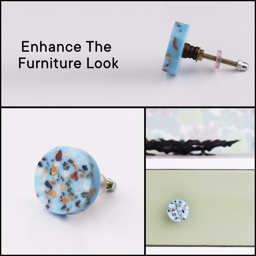 The terrazzo pattern in vibrant turquoise tones gives each knob a unique, artistic flair. This design makes these knobs stand out, adding a playful yet sophisticated touch to your furniture.
