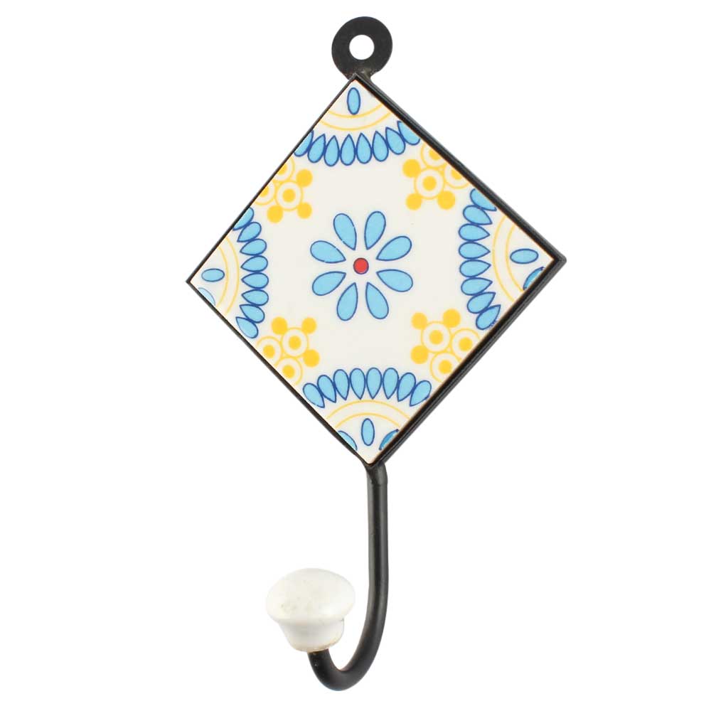 Turquoise Tiny Flower Ceramic Tile Hook. When Put on Wall or Cabinet It is An Art in Itself. The Metal Part of this Hook is Black Powder Coated.