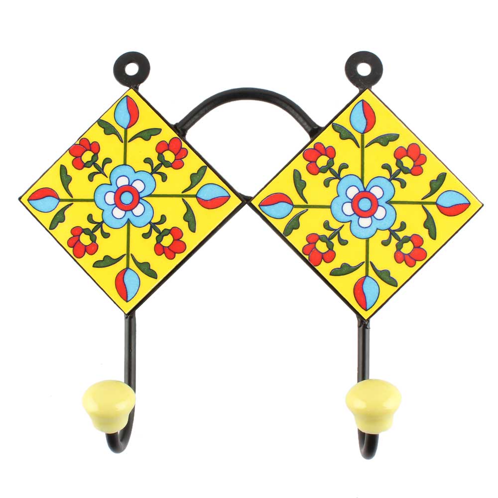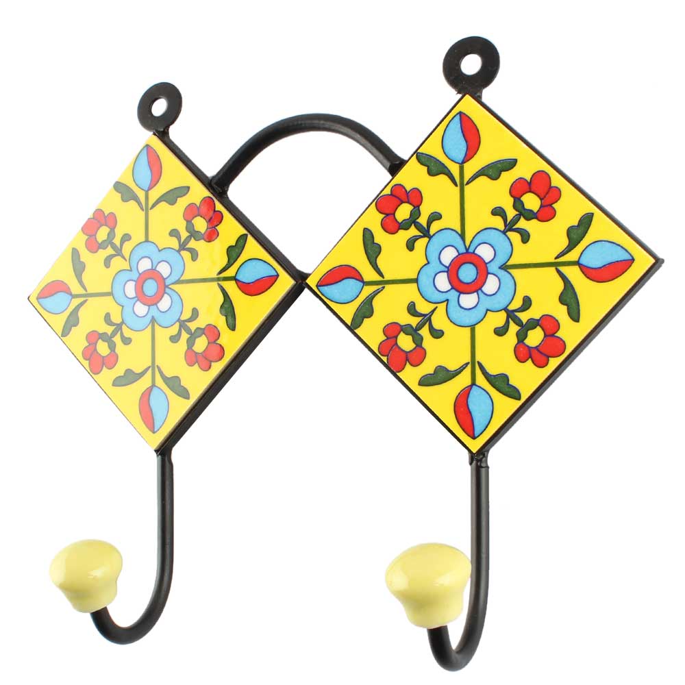Turquoise Tiny Flower Ceramic Tile Hook. When Put on Wall or Cabinet It is An Art in Itself. The Metal Part of this Hook is Black Powder Coated.