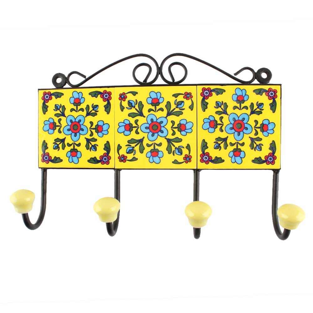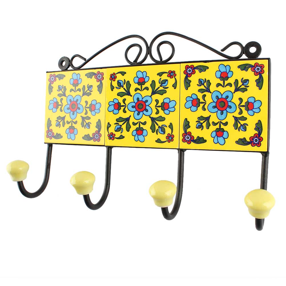 Turquoise Tiny Flower Ceramic Tile Wall Hook Online. When Put on Wall or Cabinet It is An Art in Itself. The Metal Part of this Hook is Black Powder Coated.
