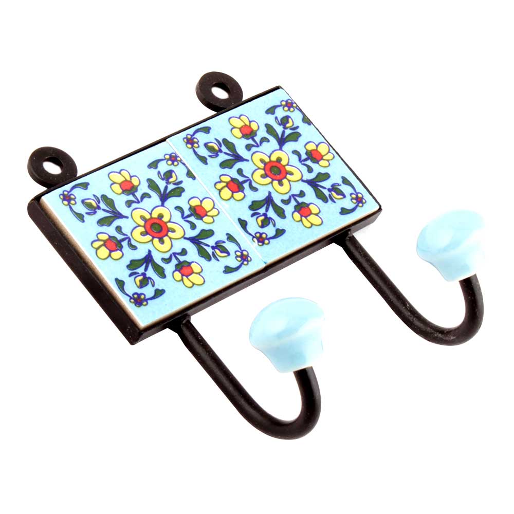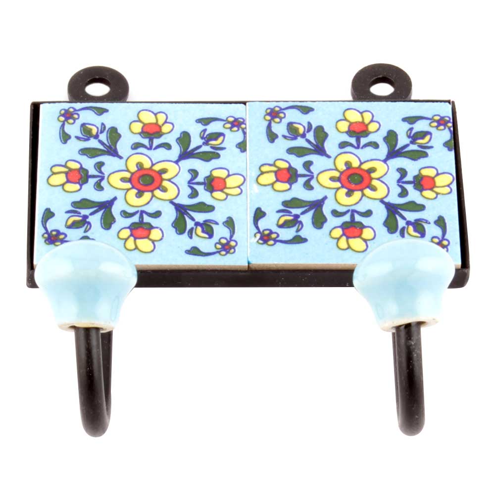 Turquoise Floral Tiles Hooks Online. When Put on Wall or Cabinet it is an Art in itself. The Metal Part of this Hook is Black Powder Coated.