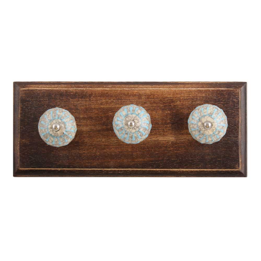 Turquoise Wheel Crackle Ceramic Wooden Hook. A Perfect Complement to the Soft Tone of the Wood are these White Traditional Hat and Coat Hook Made of Genuine Porcelain and Brass. It can be used to Hang Jewelry, Leashes, Towels, Scarves, Light Weight Sweaters, Caps etc.