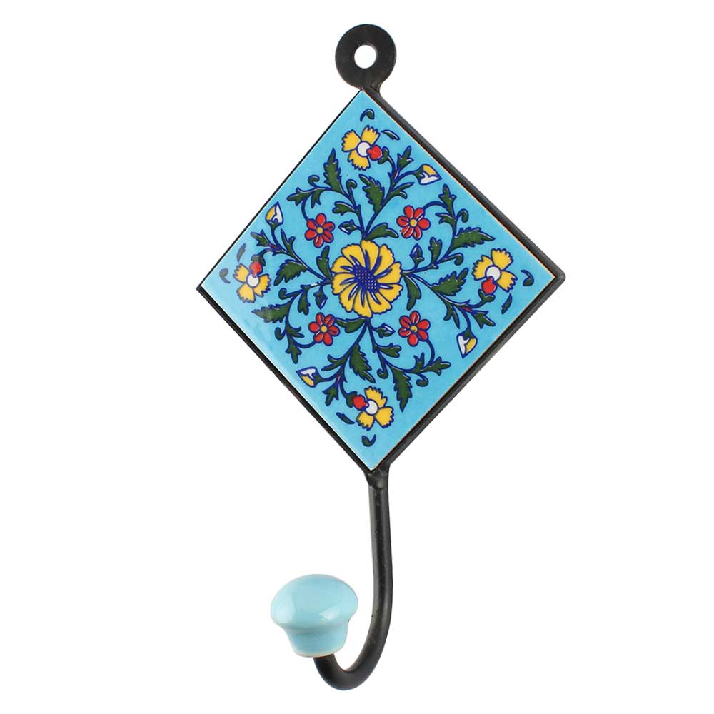 Turquoise Wheel Flower Ceramic Tiles Hooks. When Put on Wall or Cabinet It is An Art in Itself. The Metal Part of this Hook is Black Powder Coated.
