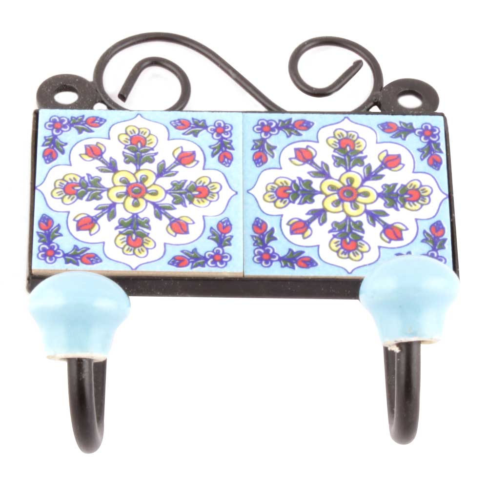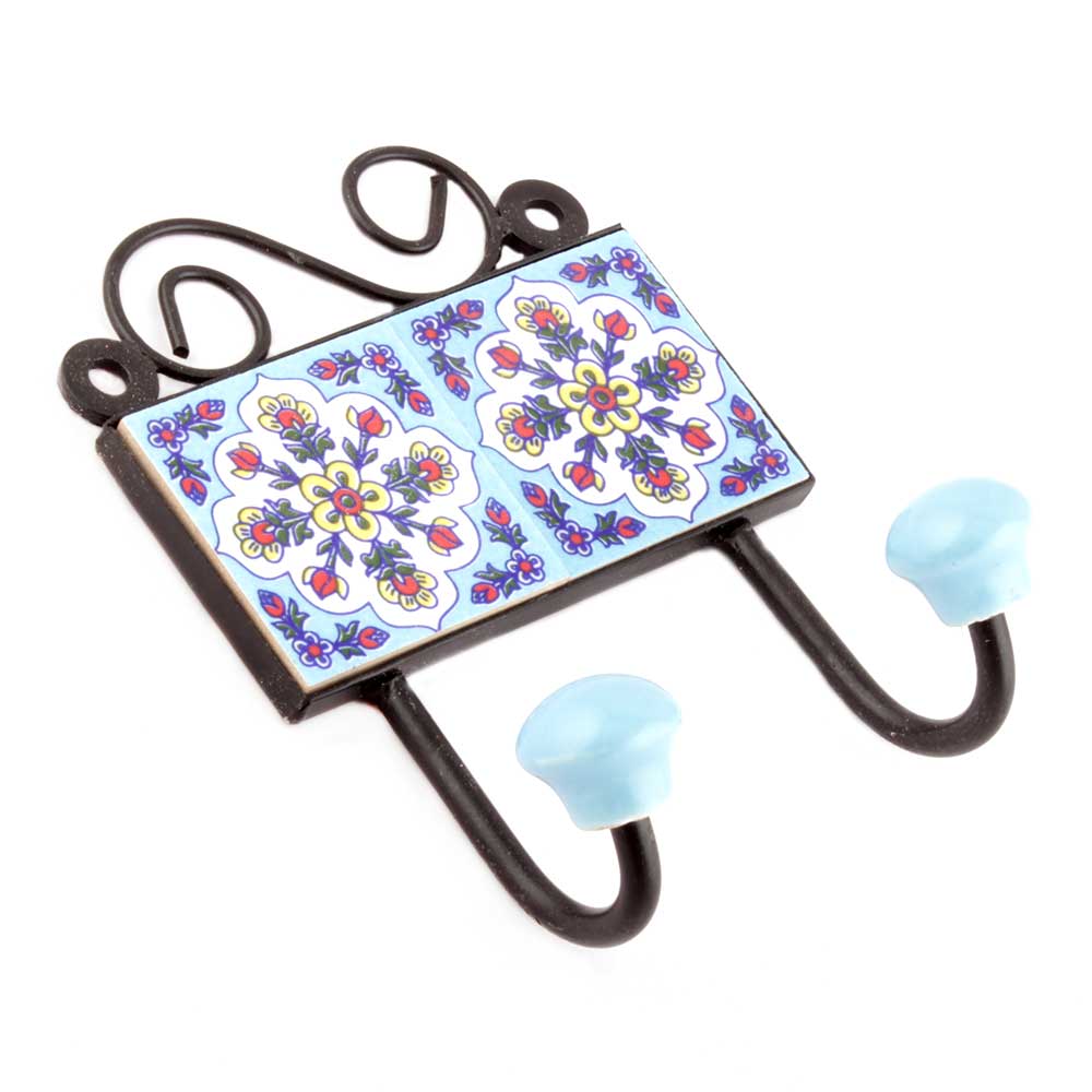 Turquoise White Floral Tiles Hooks Online. When Put on Wall or Cabinet it is an Art in itself. The Metal Part of this Hook is Black Powder Coated.
