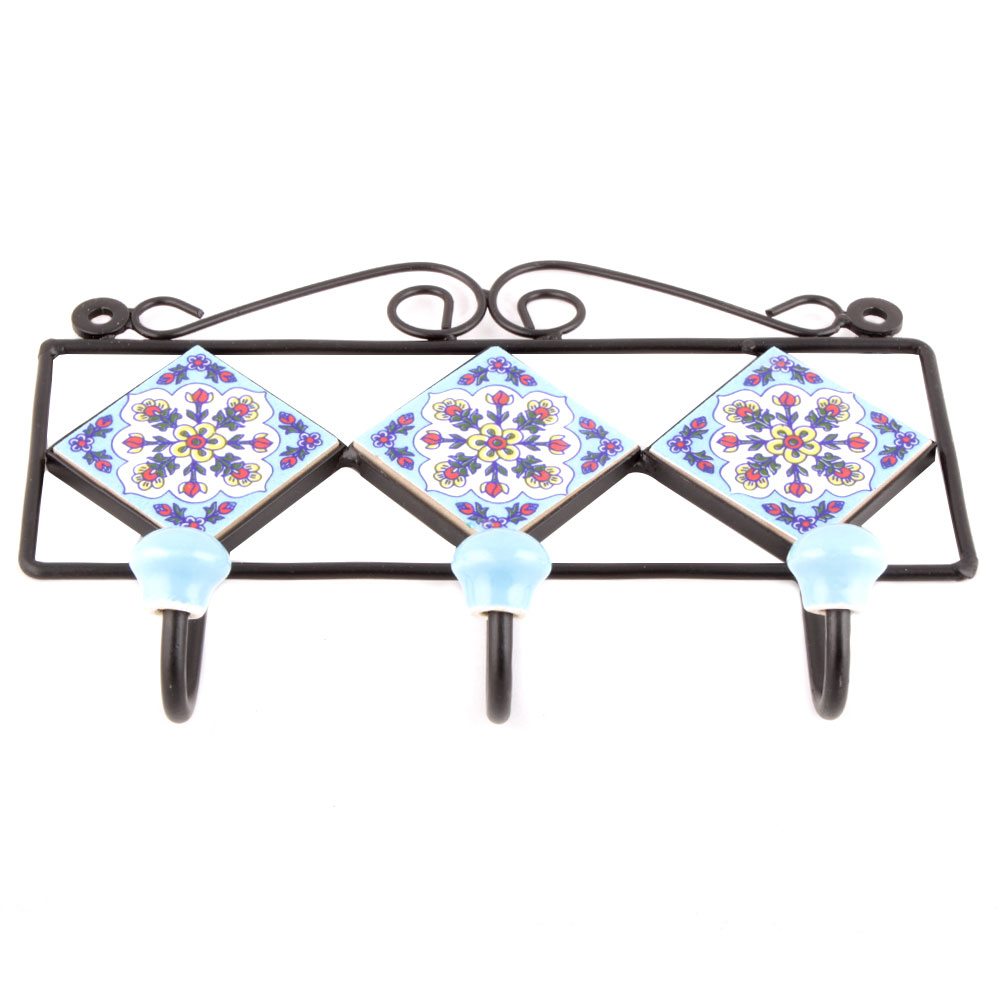 Turquoise White Floral Tiles Hooks.When Put on Wall or Cabinet it is an Art in itself. The Metal Part of this Hook is Black Powder Coated.