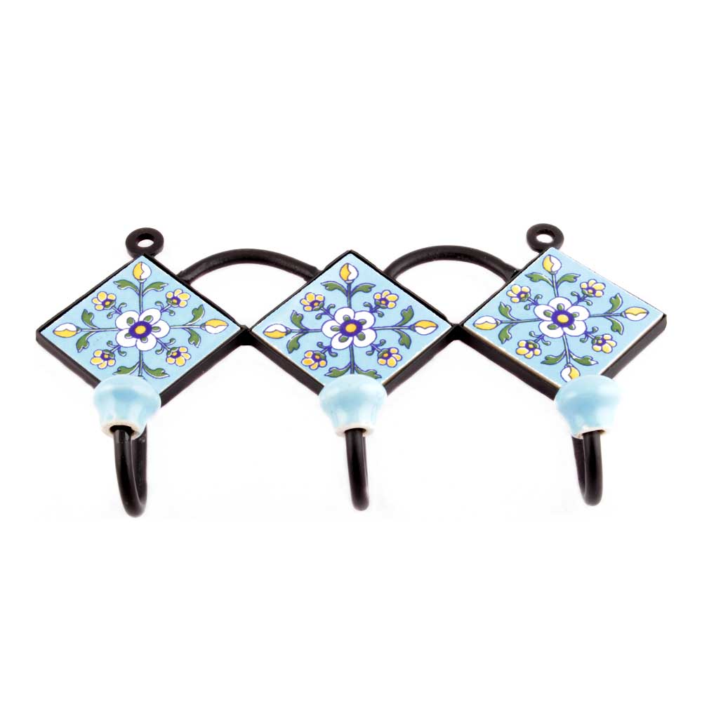 Turquoise White Tiny Flower Tiles Hooks. WhenPut on Wall or Cabinet it is an Art in itself. The Metal Part of this Hook is Black Powder Coated.