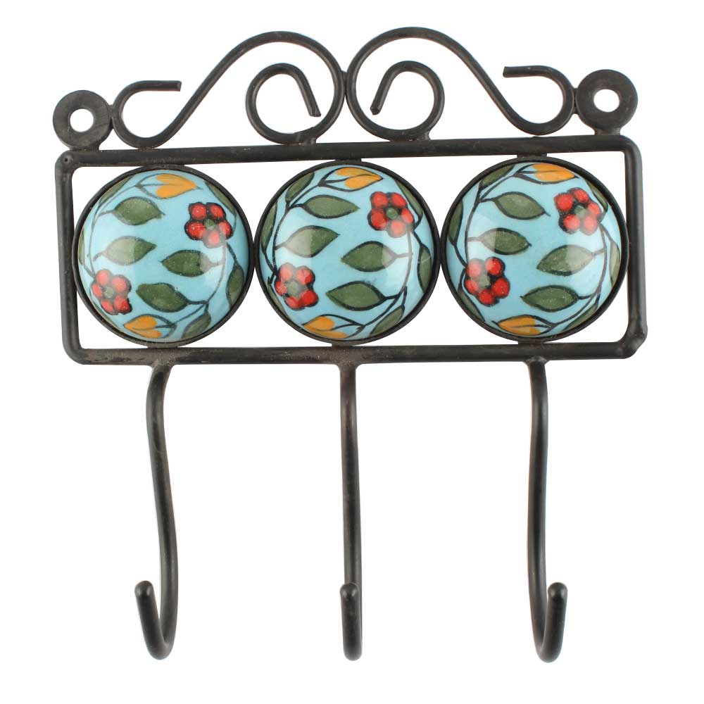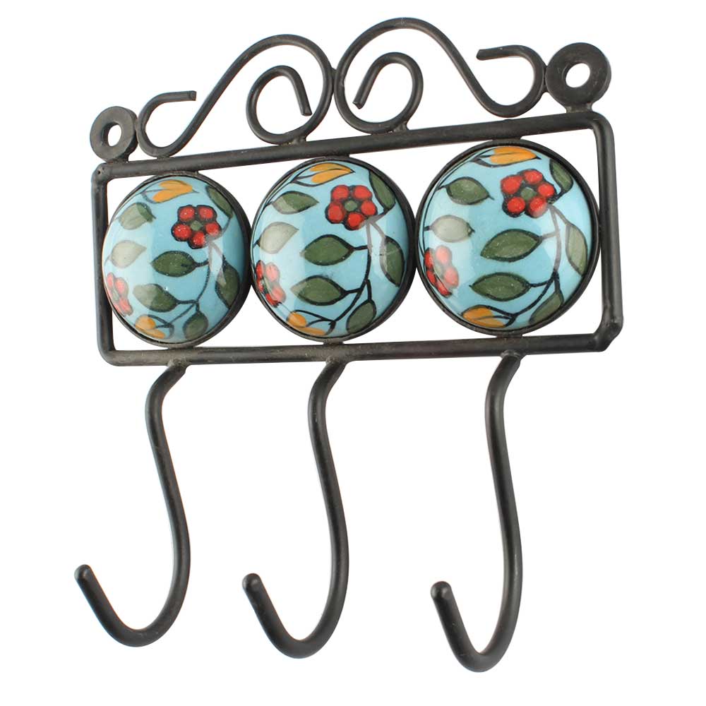 Turquoise With Green Leaf Ceramic Floral Tiles Hook. When Put on Wall or Cabinet It is An Art in Itself. The Metal Part of this Hook is Black Powder Coated.