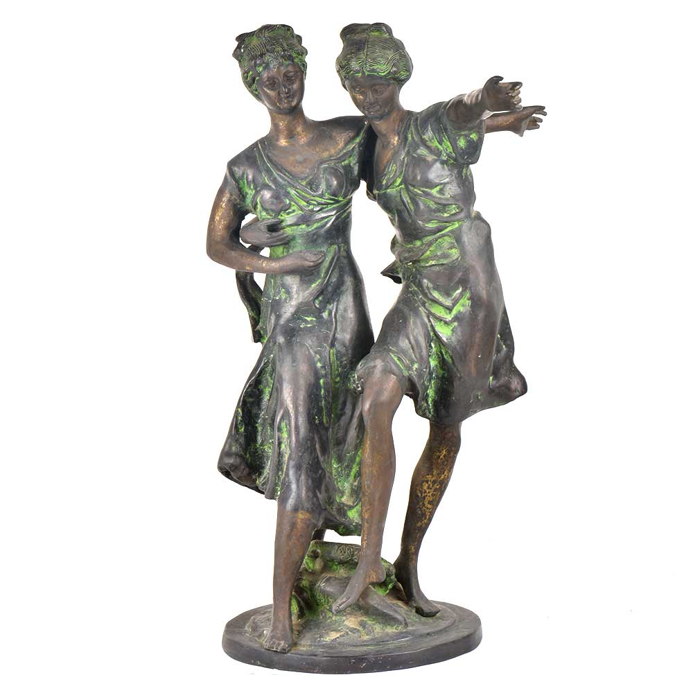 Presenting a lovely handmade Brass figurine of two dancing ladies wearing ordinary clothes with a smile on their faces . They seem to enjoy their dance and we an see the other lady is trying to teach her friend or sister to dance .The brass statue is fixed on a metal base and will look elegant in your display unit or the living room .Can also be gifted to your friemds or relatives.