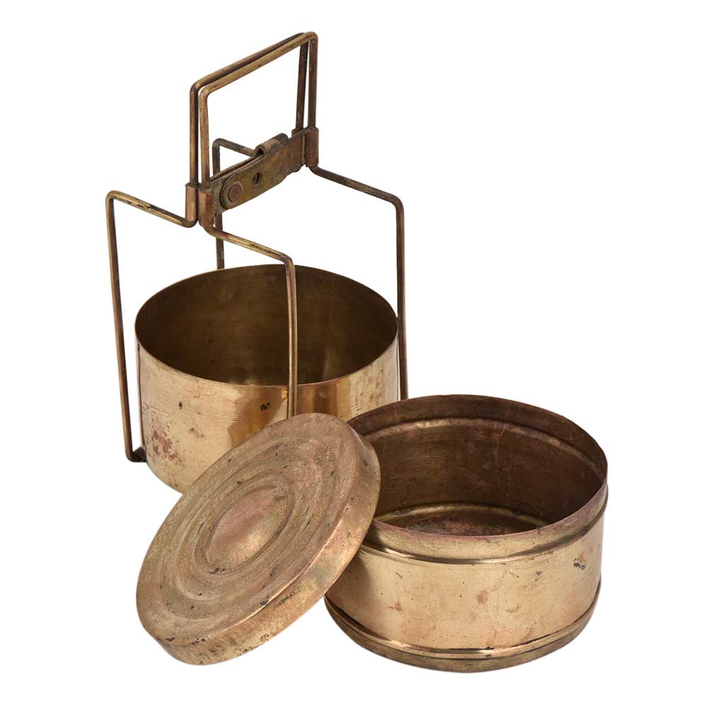 Handmade brass Tiffin box with two containers with a metal frame with two containers that is kept one above the other . It has a metal frame with a lock that keeps all the containers intact . It was earlier used for transportation of food but it is now used for home decoration on the dining table, kitchen shelf, for flower display, candies storage box or gift for your near and dear ones.