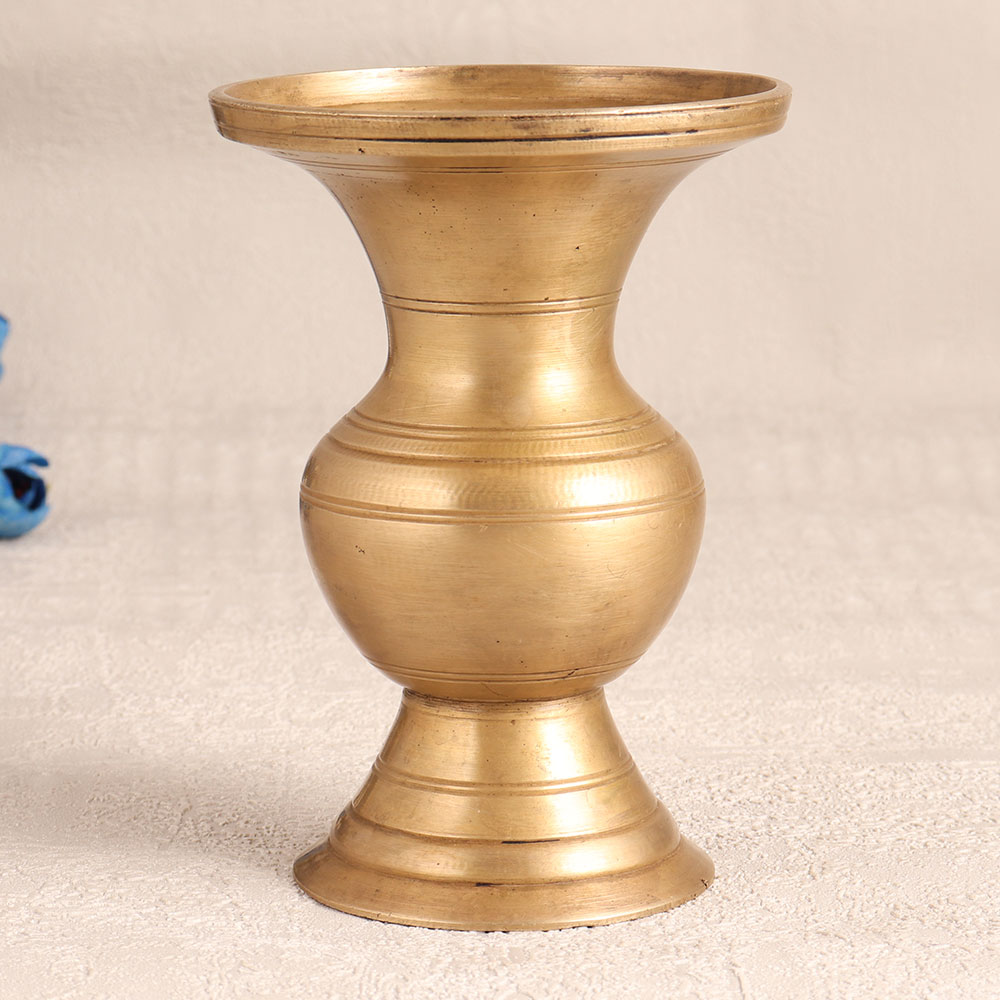 Adorn your interior with a touch of timeless elegance with our Vintage Brass Flower Pot. Handcrafted by professional Indian artisans in the traditional South Indian Art style, this exquisite piece boasts a lustrous antique golden finish that exudes opulence and charm. Meticulously constructed using high-quality brass, this flower pot is a testament to the craftsmanship that has been passed down through generations. Its exquisite design makes it a versatile addition to any setting, whether it's your home, office, hotel, cafe, shop, or restaurant. Use it to display your favourite blooms or plants, and watch as it effortlessly transforms your space into a haven of beauty and sophistication. This flower pot is not just a stunning decor piece but also an item that can be added to your vintage collection, becoming a prized possession. Its rich history and craftsmanship make it an ideal addition to exhibitions and displays. Additionally, this Vintage Brass Flower Pot makes for a thoughtful and meaningful gift for your family, friends or relatives on special, festive, or auspicious occasions, adding a touch of Indian artistry to their lives. Celebrate the beauty of tradition and artistry with this exquisite piece that promises to stand the test of time.