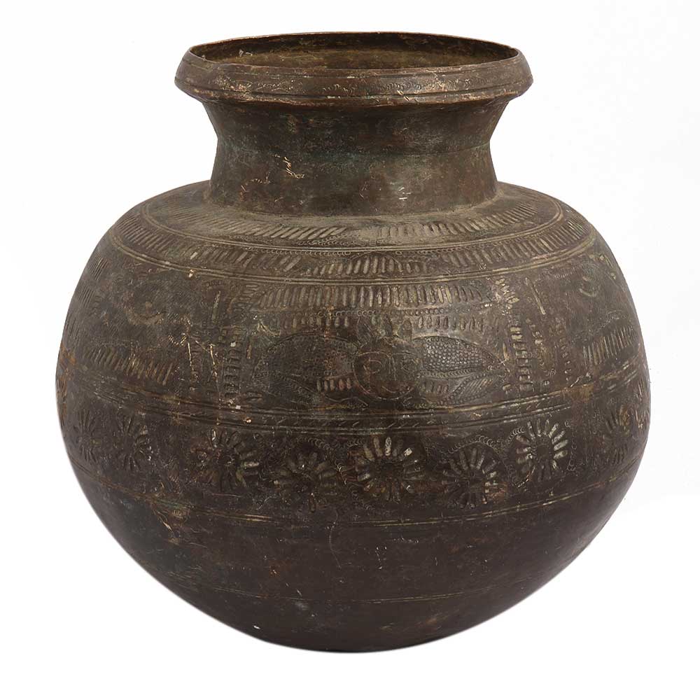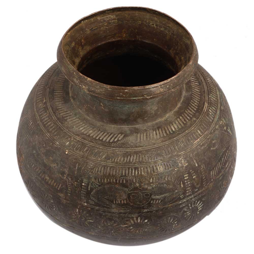 This piece has an electic presence! Be it a gifting option or for personal use, the water brass pot has held a significant place in ancient Hindu customs. The vessel made from pure brass is marked with hand-carved engravings throughout the pot. Ingrained in history, the vessel can be used for water during Surya Namaskar or watering the holy Tulsi herb in your garden.