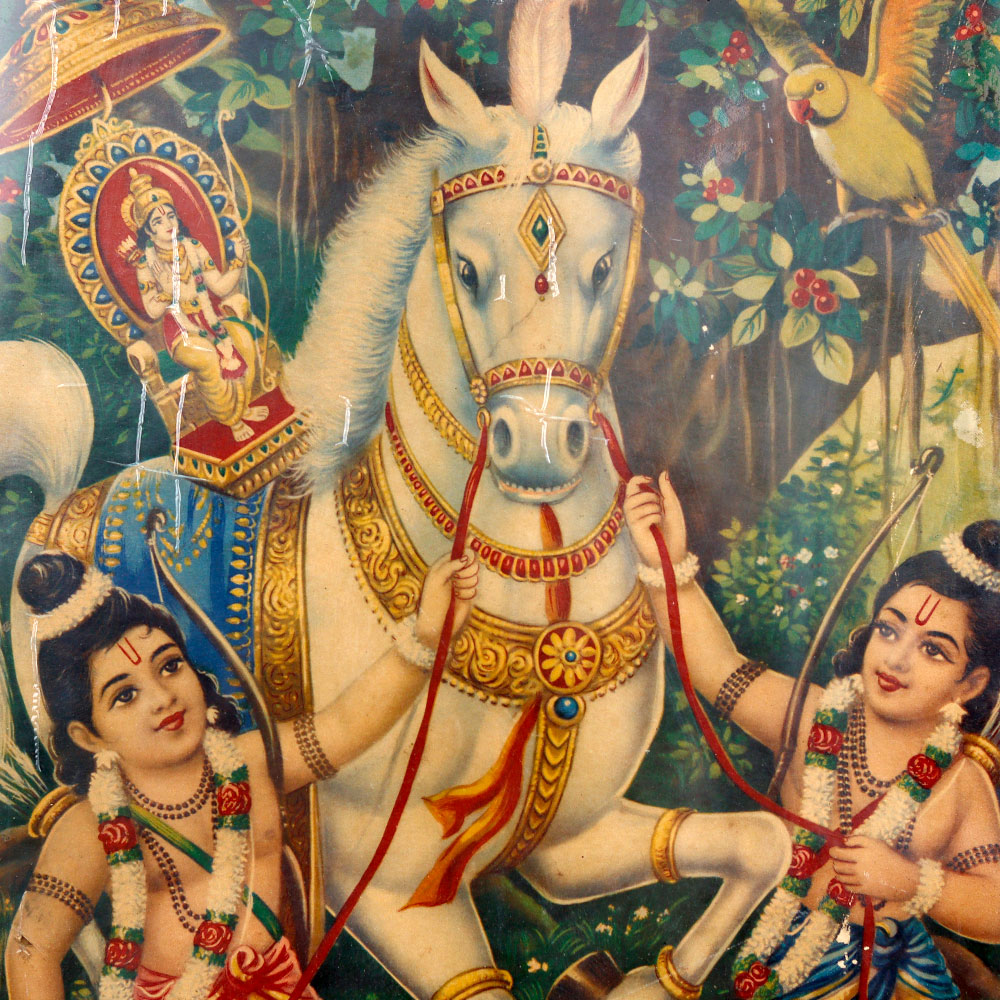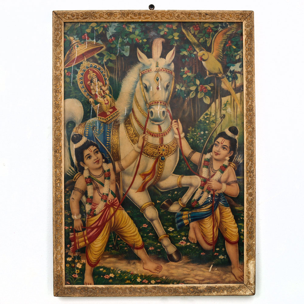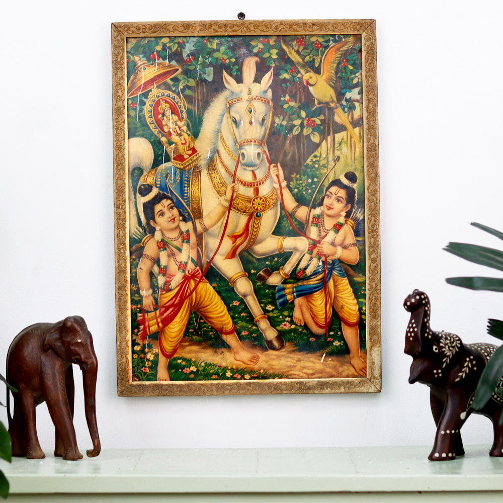 Elevate your space with the captivating vintage charm of this Luv Kush with Rama Horse painting. Expertly printed on aged, high-quality paper and framed in a sleek "Hopefully 1950" wooden frame, this one-of-a-kind piece is a true work of art that will transport you to the golden age of 1950s India. Immerse yourself in the rich cultural heritage and artistic mastery of this stunning vintage print. Whether you're adorning your walls with a treasured piece of history or seeking to elevate your décor with a touch of timeless elegance, this captivating artwork is sure to impress. Bring the magic of 1950s India into your home and let this painting inspire you every day.