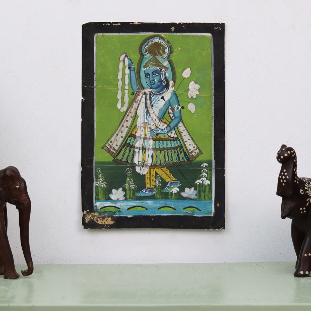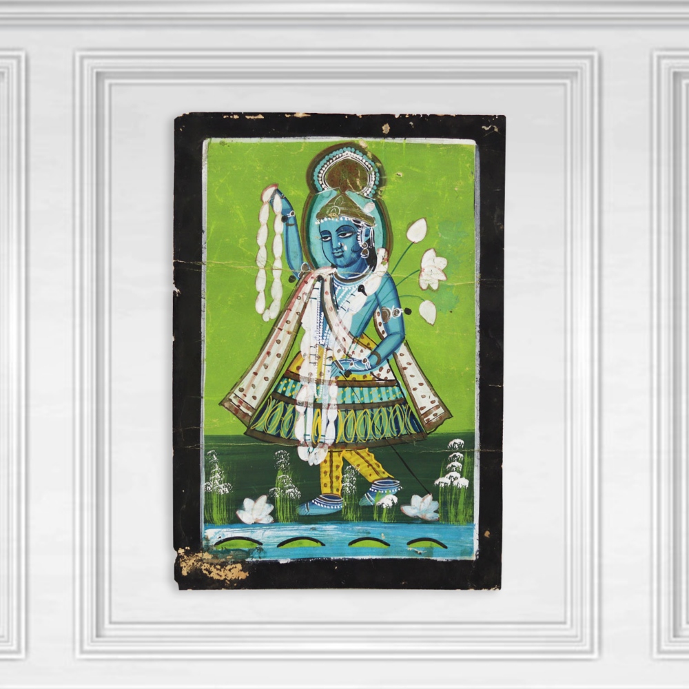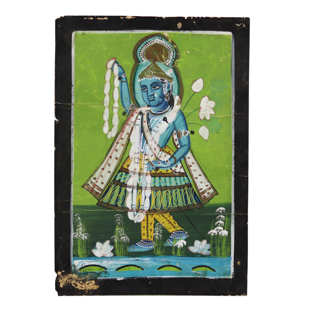 Immerse yourself in the captivating world of Lord Krishna with this exquisite Vintage Old Paper Painting. Crafted with meticulous attention to detail, this stunning artwork captures the divine essence of the revered deity, transporting you to a realm of spiritual serenity. This painting is more than just a work of art - it's a window into the rich tapestry of Hindu mythology and spirituality. Gaze upon the serene countenance of Lord Krishna and feel a sense of calm wash over you. Let the painting's timeless beauty inspire a deeper connection to the divine and the ancient traditions that it represents. Whether you're a collector of fine art, a devotee of Lord Krishna, or simply someone who appreciates the beauty of the past, this Vintage Old Paper Painting is a must-have addition to your collection. Elevate your living space and surround yourself with the enchanting essence of this exceptional piece. Embark on a journey of spiritual and artistic discovery with this Vintage Old Paper Painting of Lord Krishna.