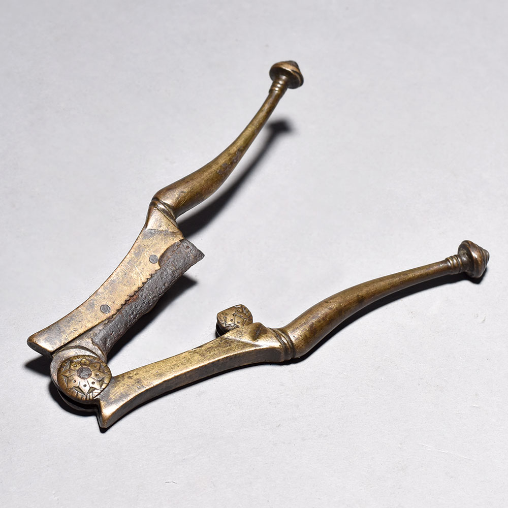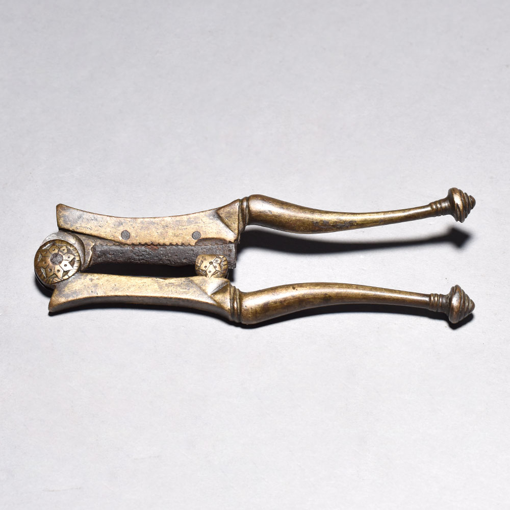 Discover the essence of Eastern culture with this captivating Vintage Betel Nut Cutter. Expertly crafted from robust brass iron, this traditional tool boasts a central blade and dual handles - the quintessential design for effortlessly slicing open betel nuts.