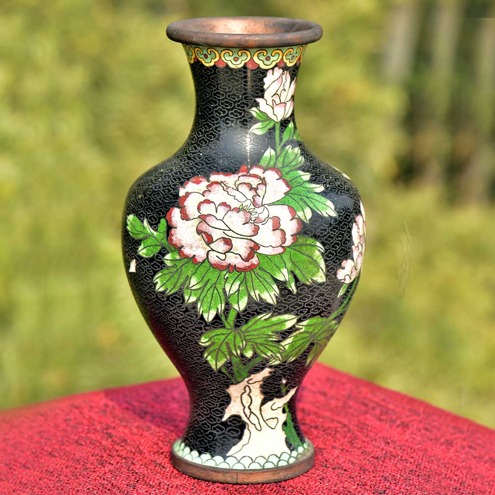 Decorative enameled metal ware called cloisonné exhibit almost superhuman skill by master craftsmen displayed by the marvelous diversity, intricacy and beauty of their designs. Earliest decorative motifs include cloud patterns, lotus flowers, the symbol of purity and beauty later motifs included dragons amid clouds, floral landscapes, scenes from court and mystical animals. Exquisitely detailed petals and leaves with fine color gradations. Fine inlaid wirework at neck and base, which are edged in brass. Exquisitely detailed petals and leaves with fine color gradations. Dark cobalt blue ground with white, rust, orange, yellow, and mauve blossoms; foliage in shades of green edged in rust are some of the popular designs of cloisonné.