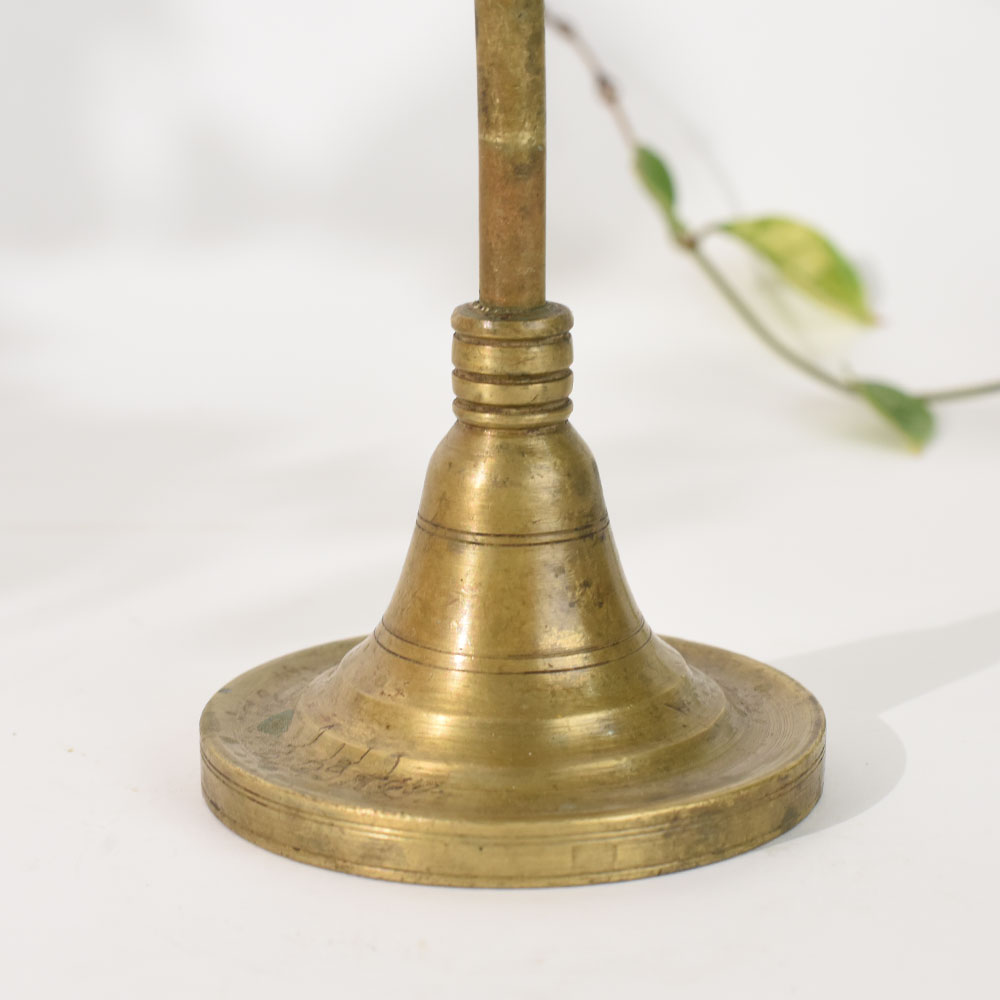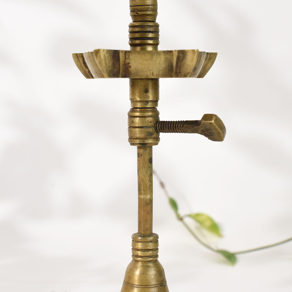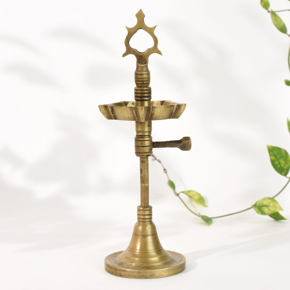 This vintage brass oil lamp stand with adjustable height is a remarkable example of South Indian ritual craftsmanship. Hand-shaped from solid brass, it features a tall tapered column, flared pedestal base, and a beautifully carved petal-shaped oil dish. The slender adjusting screw allows the height to be modified, reflecting an old-world functional design once used in traditional ceremonies, temple rituals, and ancestral puja setups. The ornate openwork finial at the top adds a spiritual essence, making this lamp stand an elegant blend of utility and artistry. Its aged brass patina tells a story of decades of use, devotion, and skilled handmade craftsmanship. Whether used in a pooja room or displayed as a cultural decor accent, it adds warmth, heritage, and a sacred presence to any space. Perfect for collectors of antique brassware, decor stylists, or anyone who appreciates vintage Indian craftsmanship, this piece is both meaningful and visually captivating.