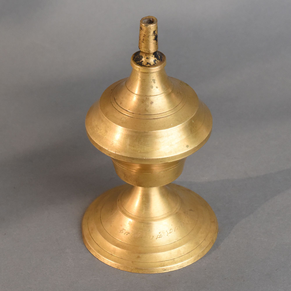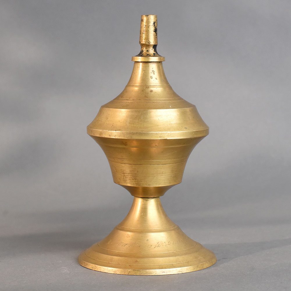 This vintage brass oil lamp from Central India is a fine example of traditional craftsmanship and cultural heritage. Handmade with precision, it features a simple yet elegant design with a sturdy base and a covered top section. Historically used in temples and homes for lighting during rituals, it holds deep spiritual significance. The smooth brass finish and balanced form highlight its authenticity, making it a treasured collectible for lovers of vintage decor. Beyond its ritualistic function, this lamp serves as a timeless decorative piece that reflects the artistry and traditions of Central India. With its antique charm and durable build, it is ideal for pooja rooms, heritage displays, or as a meaningful gift for those who appreciate Indian culture.