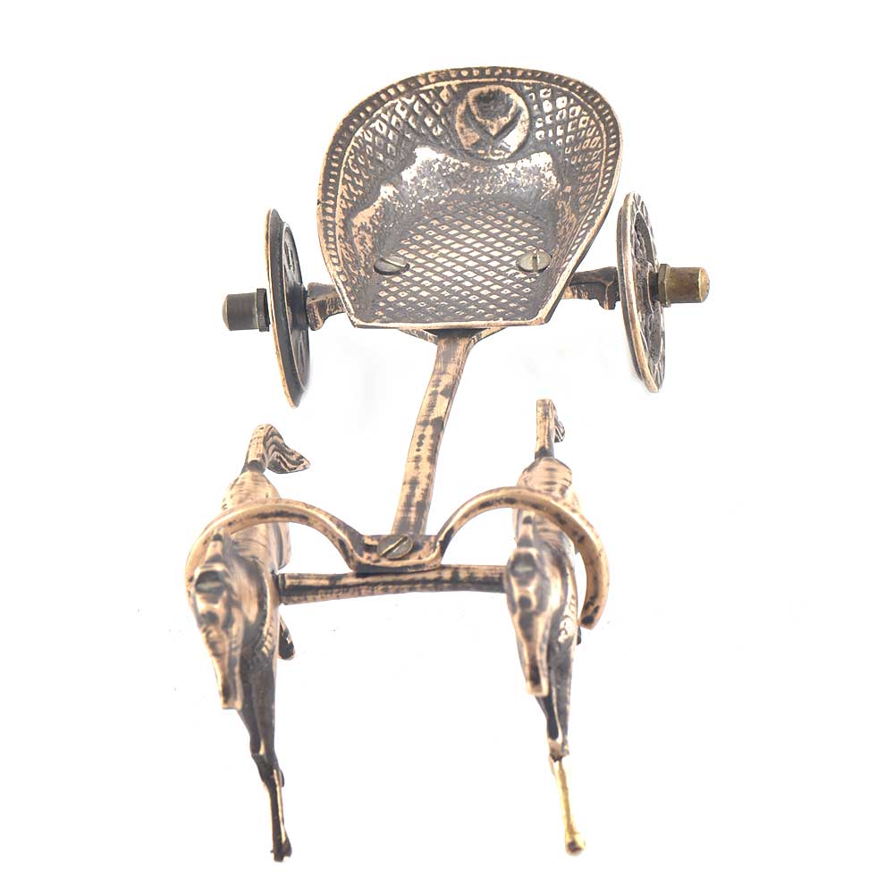 This is a brass horse driven carriage (buggy in Hindi) which was hooded for the sake of royal commute. The wooden carriage wheels, the carriers and the horse hoofs are highlighted in gold while the remaining is in oxidised black. The carvings like the features of the horse, driver and the hood. It's a gift to be placed on the fireplace, writing table or simply on a wooden table with a clear glass top next to the brass pencil/pen stand or a photo frame.