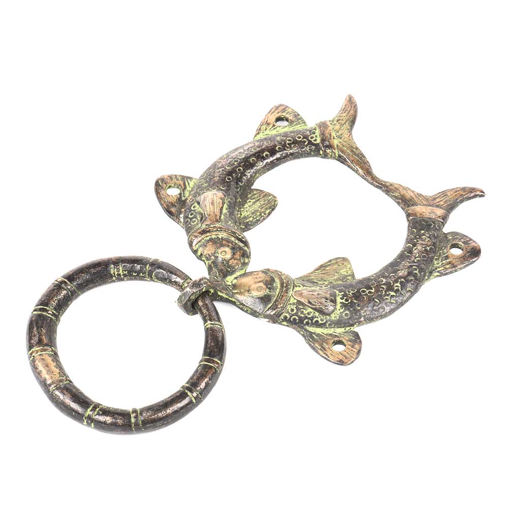 An exquisite work of art by the skilled craftsman of India it can be used for door knocker as well as home decor. Green color engraved decorative brass metal door knocker having kissing fish Design.