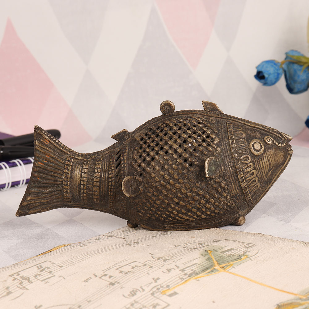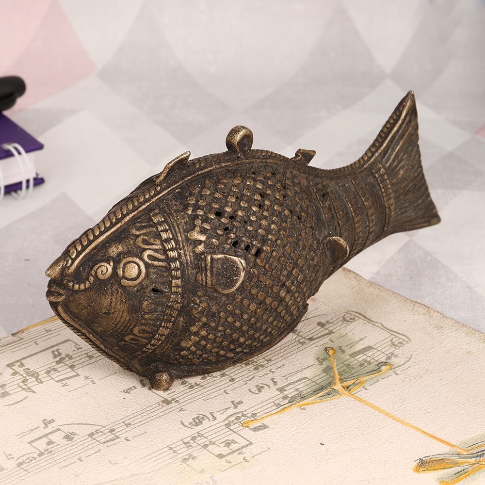 Adorn your decor with the exquisite charm of our handmade Brass Fish Statue that is meticulously crafted by skilled Indian artisans. This stunning piece features an antique brown finish that lends it an air of timeless elegance. Crafted from high-quality brass, this fish statue embodies exceptional craftsmanship and attention to detail. Its versatile design makes it a perfect addition to various settings, including your home, office, restaurant, hotel, cafe, or shop. Place it on a mantel, desk, or shelf to instantly elevate the ambiance with its artistic allure. Beyond its decorative appeal, this brass fish statue also doubles as a functional item. Use it as a paperweight to add a touch of sophistication to your workspace. Its intricate design and antique finish make it a prized addition to any vintage collection or exhibition. Celebrate special occasions by gifting this exquisite piece to your family, friends or relatives, making their day even more memorable. Whether it's a festive celebration or an auspicious event, this Brass Fish Statue is a timeless and meaningful present that will be cherished for years to come. Embrace the artistry of Indian craftsmanship with this versatile and elegant decor piece.