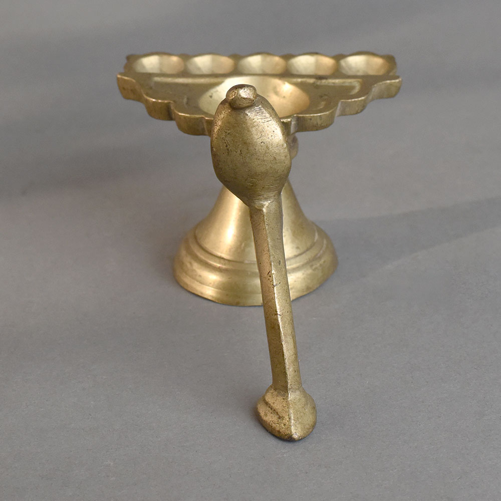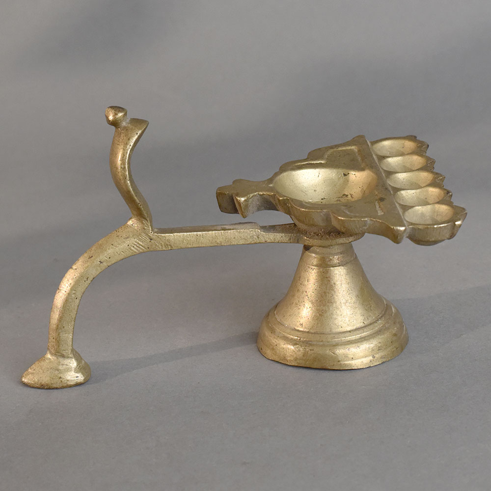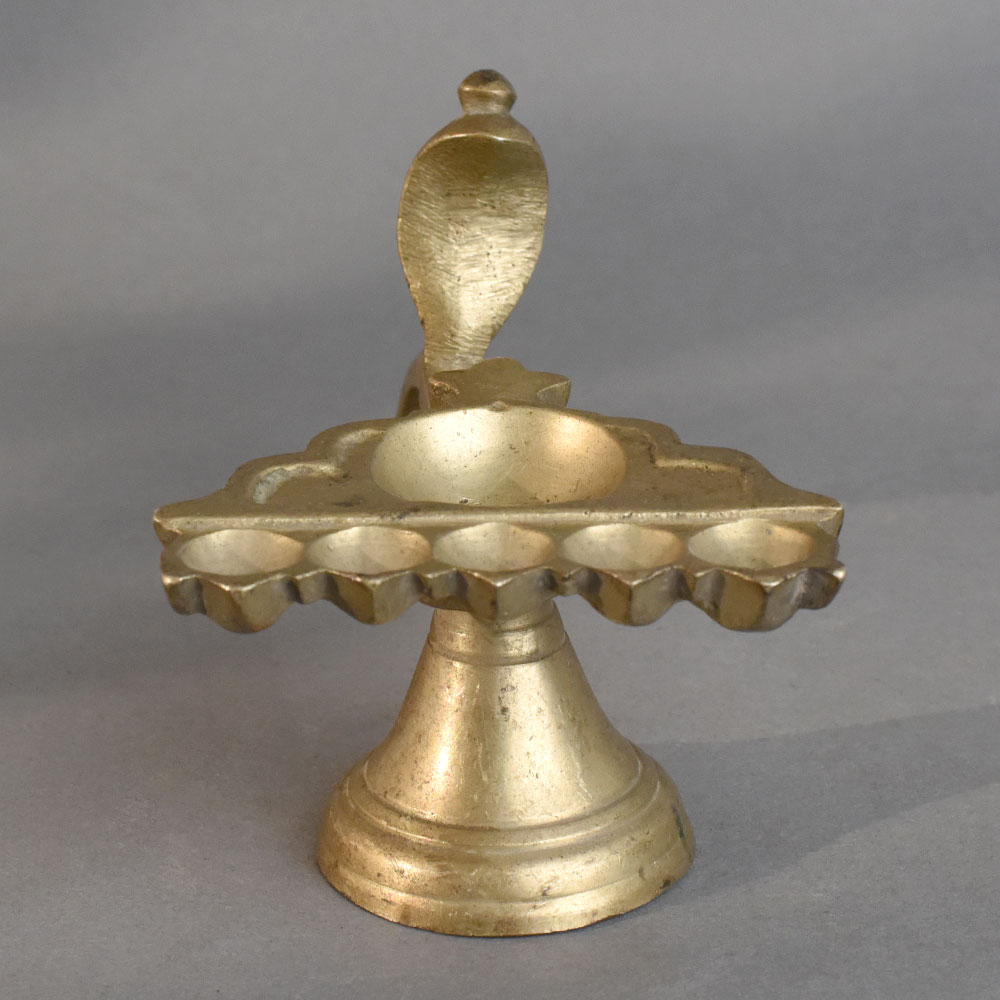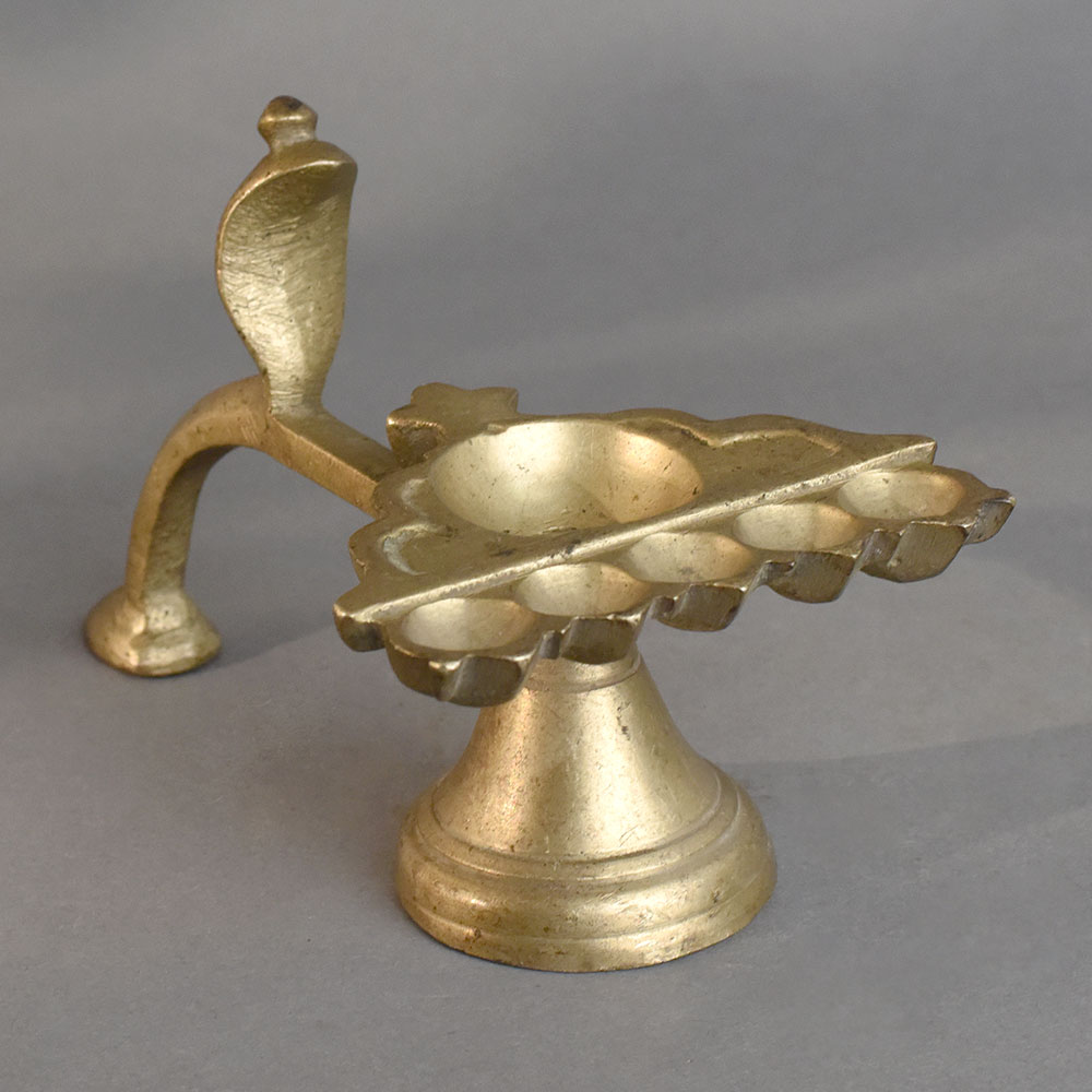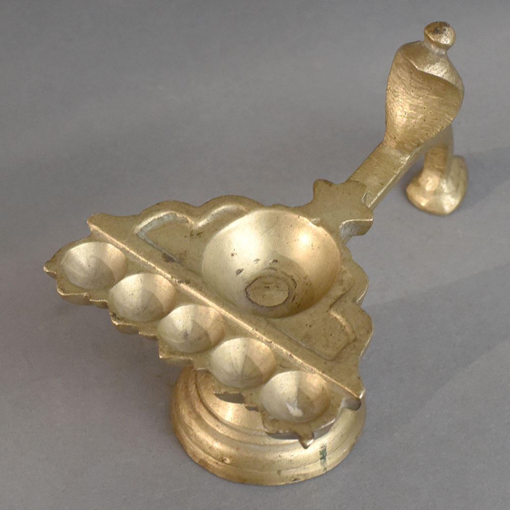 This vintage brass aarti oil lamp with handle is a traditional piece of Indian devotional art, designed for spiritual rituals and ceremonies. Featuring five small cavities for wicks, it allows multiple jyots to be lit at once, spreading divine energy and positivity during pooja. The lamp is crafted from durable solid brass, giving it strength, longevity, and an authentic antique appearance. Its sturdy handle ensures easy holding while performing aarti, making it both practical and devotional. The elegant base and carved detailing highlight its handmade craftsmanship, reflecting the cultural heritage of India. Ideal for temples, pooja rooms, and auspicious occasions, this lamp serves as both a functional ritual item and a collectible decor piece that embodies timeless tradition.