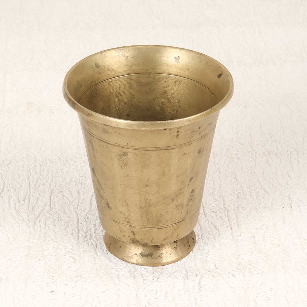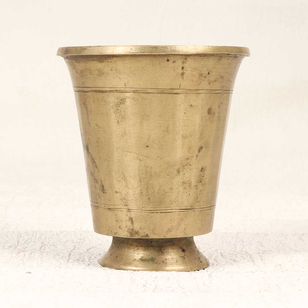 Immerse yourself in South Indian heritage with this exquisite vintage brass Panchpatra pot. With its gorgeously weathered finish and ornate detailing, this pot evokes the rich spirituality of ancient traditions. Both visually striking and deeply symbolic, this brass Panchpatra pot combines impeccable artisanship with profound meaning. Bring a piece of South Indian tradition into your home with this beautifully crafted pot. Use it to infuse your puja practice with a symbolic ritual, display it as an elegant spiritual decor piece, or simply let its earthy elegance elevate the energy of any room. However, if you incorporate this Panchpatra pot into your home, its heritage and artistry will deepen your spiritual practice.