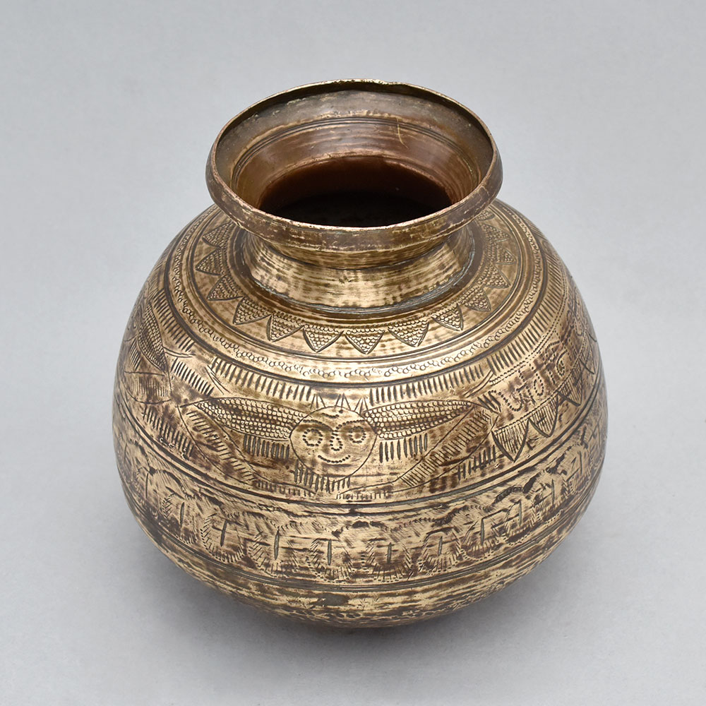 Bring the spiritual essence of Orissa into your home with the Vintage Brass Holy Water Pot.This antique brass pot is a stunning example of the intricate artistry and deep cultural significance found in the Indian state of Orissa. The intricate motifs and designs etched into the metal pay homage to the region's rich heritage, imbuing this piece with a sense of timeless spirituality. Whether used to bless your home, enhance your meditation practice, or simply admired as a work of art, the Vintage Brass Holy Water Pot from Orissa will elevate your experience. Its versatile design allows it to seamlessly integrate into any space, while its historical significance will captivate anyone with an appreciation for Indian culture and craftsmanship. Ornate brass construction with traditional Orissan carvings Rounded vessel with a flared rim for easy pouring Historically used to hold water for sacred ceremonies Versatile as a decorative accent or ritual vessel
