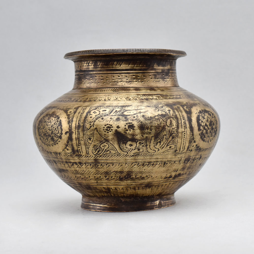 Infuse your home with timeless elegance and cultural significance with this vintage holy water pot, a stunning brass centerpiece adorned with exquisite carvings.This holy water pot is a work of art that effortlessly bridges the gap between the spiritual and the practical. Its detailed carvings of majestic animals imbue the piece with a sense of reverence, making it the perfect addition to your meditation space, altar, or living room. Whether you choose to use it for its intended purpose or as a unique decorative accent, this vintage pot will elevate your home with its timeless beauty and cultural significance. Handcrafted with intricate designs of elephants, deer, and lions Can be used for sacred ceremonies or as a decorative flower vase Rounded shape with a flared rim for eye-catching display Made of durable, high-quality brass