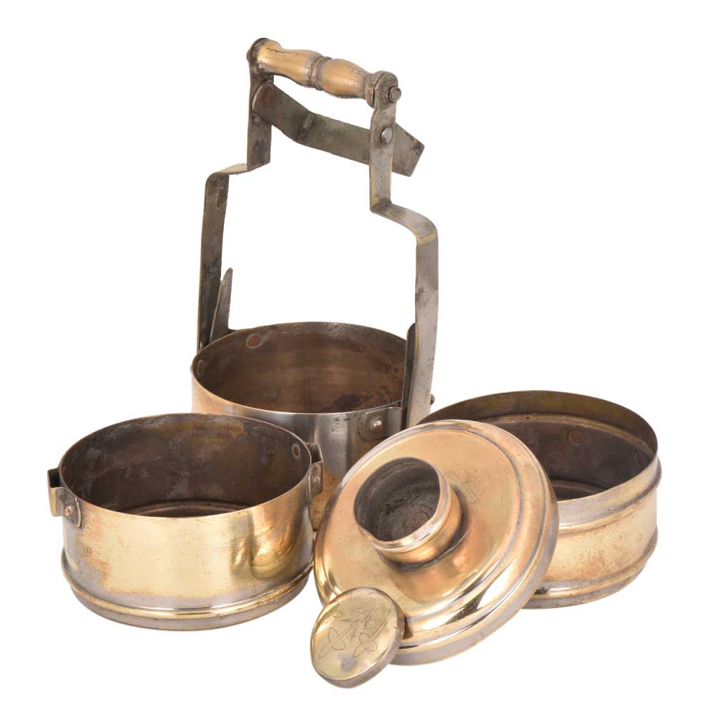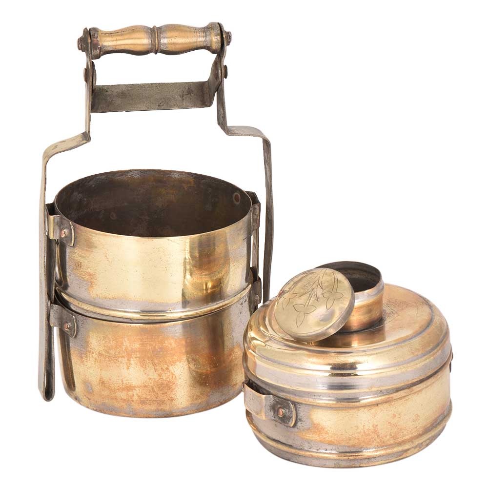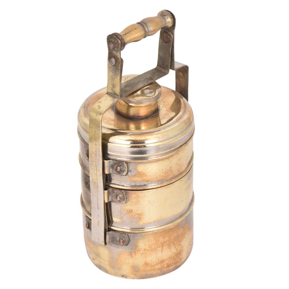 A Brass made vintage lunch box with three separation and a little box on top with a shiny finish and a designer handle that gives it a classy touch.