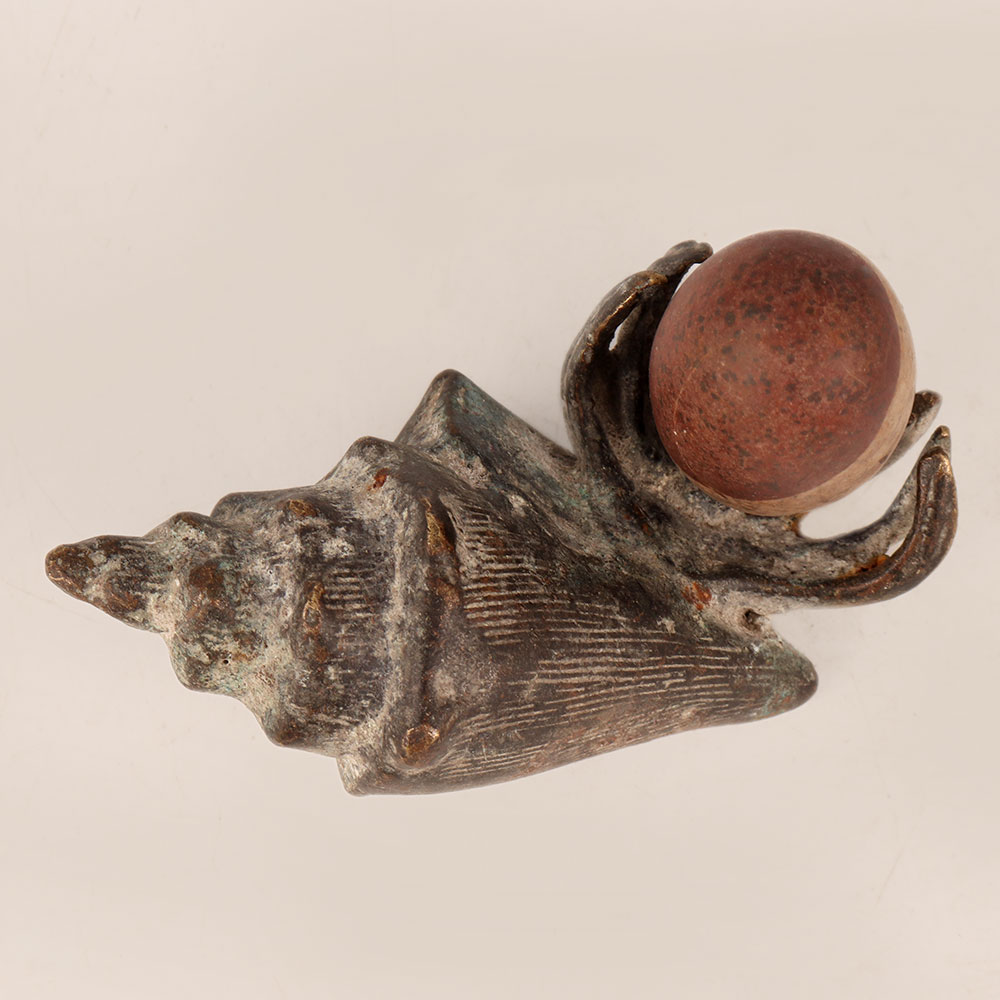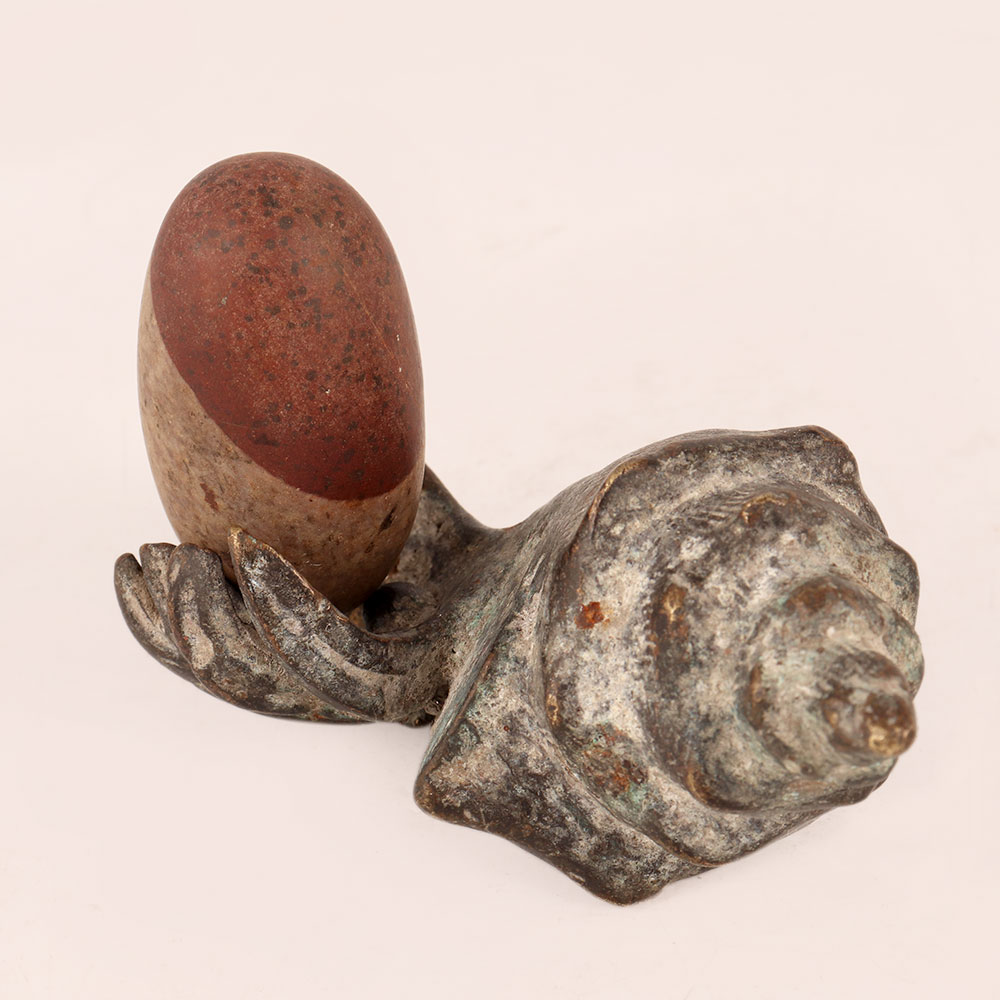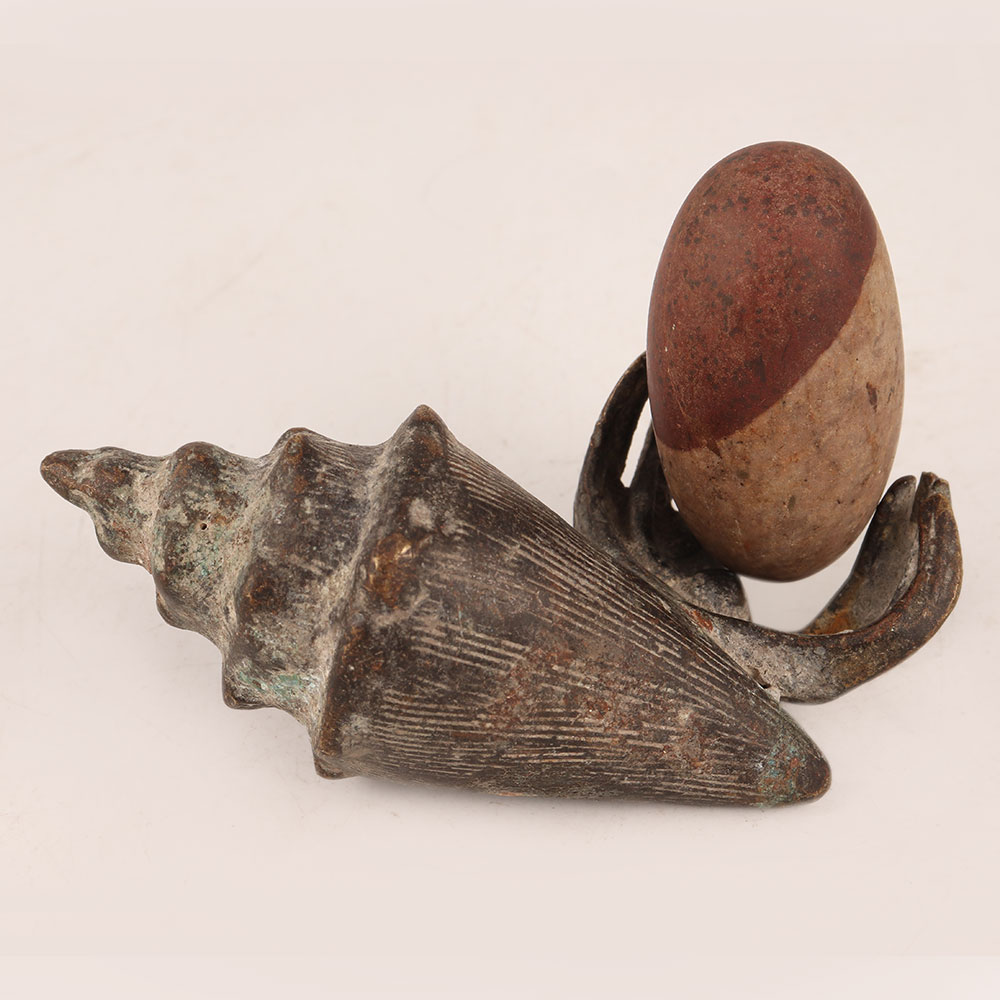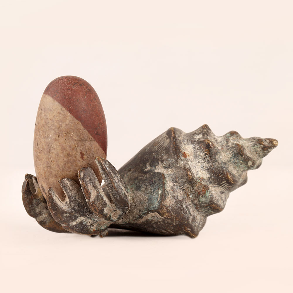 Experience the essence of timeless spirituality with our Vintage Brass Shell holding Lingam, meticulously handcrafted by talented Indian artisans in the heart of Himalayan Artistry. This masterpiece captures the rich heritage of Indian craftsmanship, featuring a beautifully aged antique finish that lends an air of authenticity and reverence. Crafted with devotion, the Lingam, a revered symbol of divinity and energy, is made from natural stone, each unique in its formation, adding to the charm of this sacred piece. The brass shell cradling the Lingam creates a harmonious blend of materials, further enhancing its aesthetic appeal. This versatile piece finds its place gracefully in various settings – be it your home, office, restaurant, hotel, cafe, or shop's prayer room. Its inherent spiritual aura makes it an ideal focal point for meditation and reflection, while its artistic beauty elevates any space's decor. Collectors of vintage treasures will delight in adding this brass Shell holding Lingam to their assemblage, celebrating both its historical and artistic significance. Additionally, this masterpiece is a thoughtful gift choice, perfect for sharing your affection on special, festive, or auspicious occasions. Embrace the aura of ancient spirituality, celebrate artistry, and create an ambiance of reverence with this remarkable creation that echoes the centuries-old traditions of the Himalayas.