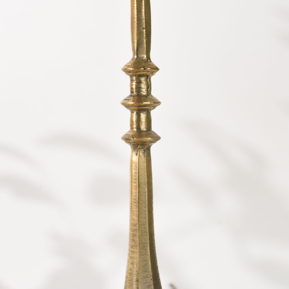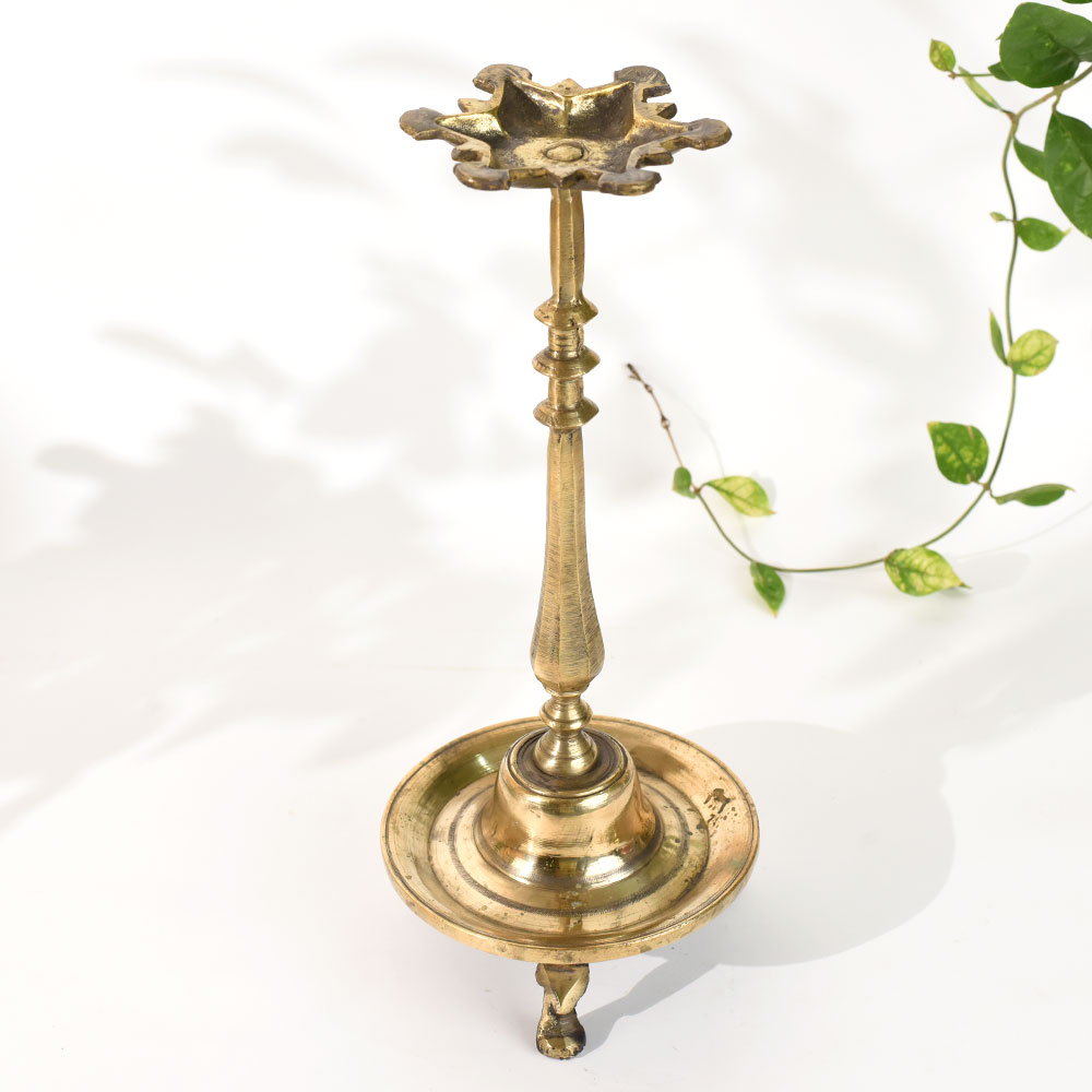 Elevate your home decor with this vintage brass oil lamp stand inspired by traditional South Indian art. Crafted with a tall, elegant stem and a beautifully shaped diya holder, this lamp stand showcases the timeless charm of temple-style craftsmanship. The base is designed with sturdy ornamental legs, offering excellent balance while adding a distinct antique appeal. Handmade from solid brass, it features a warm golden patina that enhances its heritage look, making it an ideal choice for pooja rooms, spiritual corners, or cultural interior styling. Whether used during rituals or displayed as a collectors piece, it brings an aura of devotion and artistry to any setting.