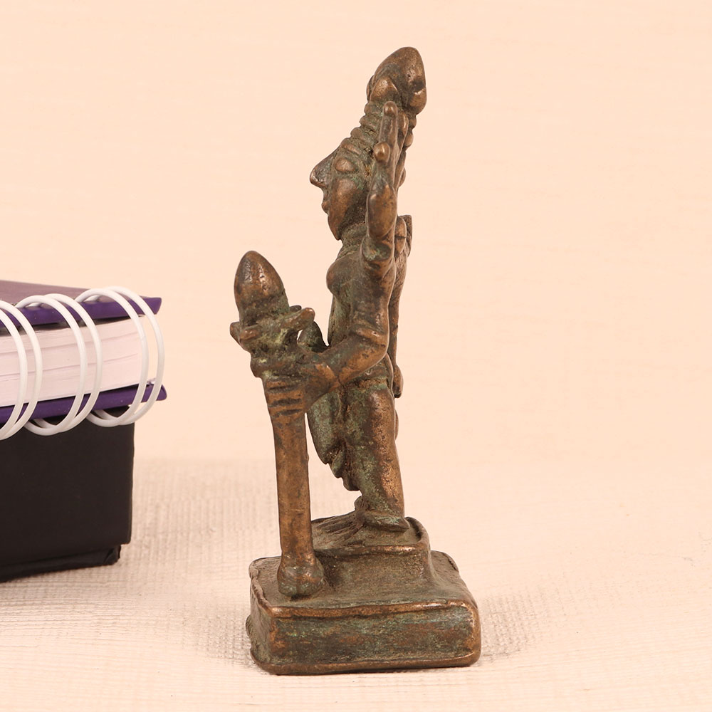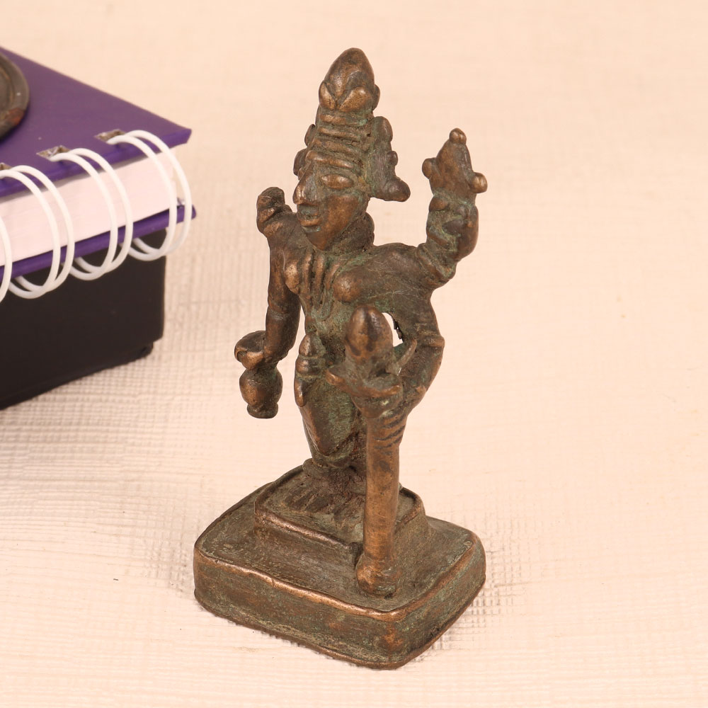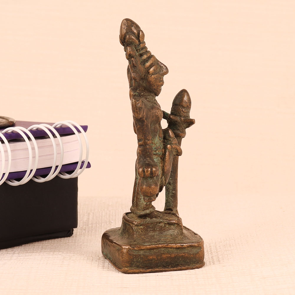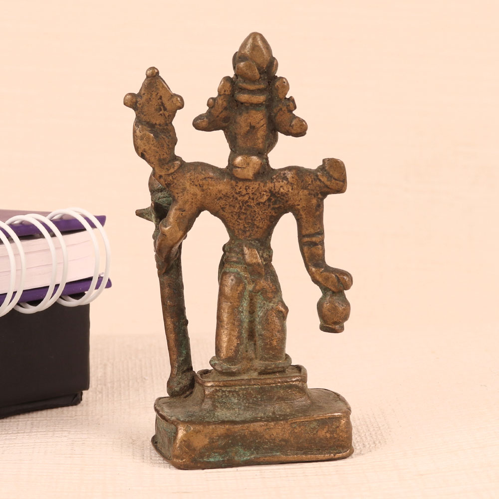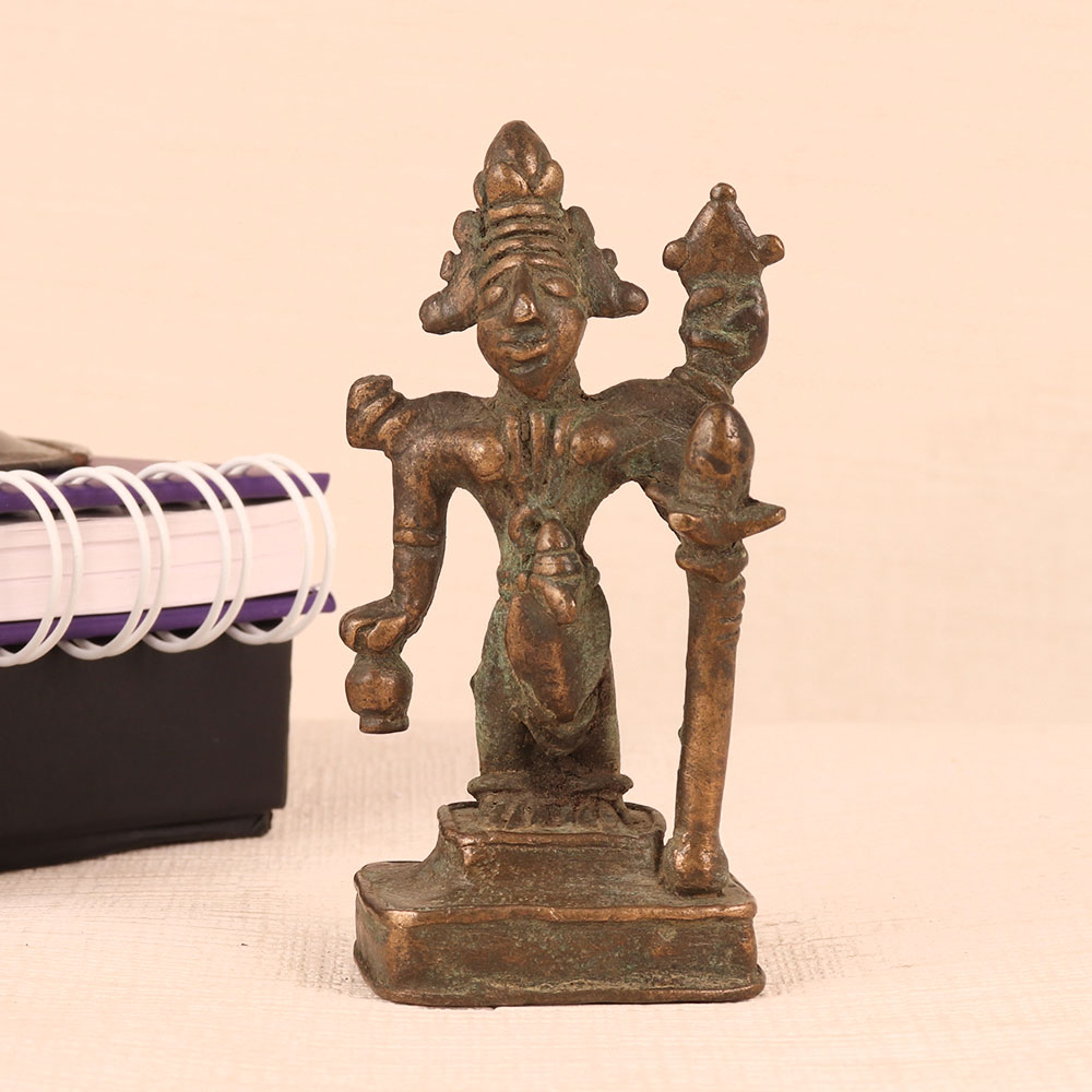 Enhance your home decor with the timeless elegance of this small vintage brass statue of a Hindu God, expertly crafted by skilled Indian artisans. Standing gracefully on a meticulously designed platform, this exquisite piece boasts an antique brown finish that exudes an aura of age-old charm. Every intricate detail of this statue showcases the remarkable craftsmanship that went into its creation. Fashioned from high-quality brass, it not only serves as a symbol of devotion but also as a work of art that can enhance the aesthetics of any setting. Versatile and meaningful, this statue can find its place in your home, office, restaurant, hotel, cafe, or shop's prayer room, where it can serve both as an object of worship and a captivating decoration. Collectors will appreciate the opportunity to add this piece to their vintage collection, while its timeless appeal makes it a thoughtful gift for family, friends or relatives on special, festive, or auspicious occasions. Embrace the heritage and spirituality embodied in this vintage brass statue, and let it radiate its beauty and significance throughout your space.