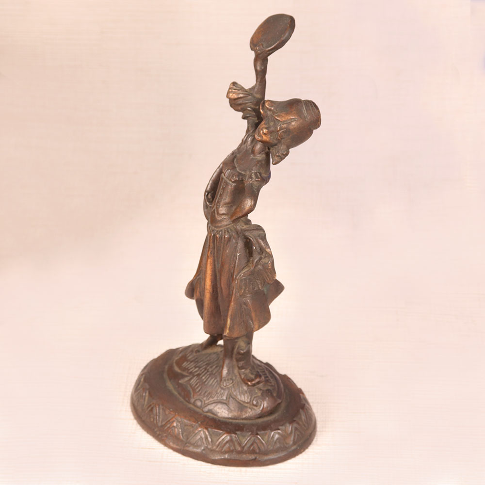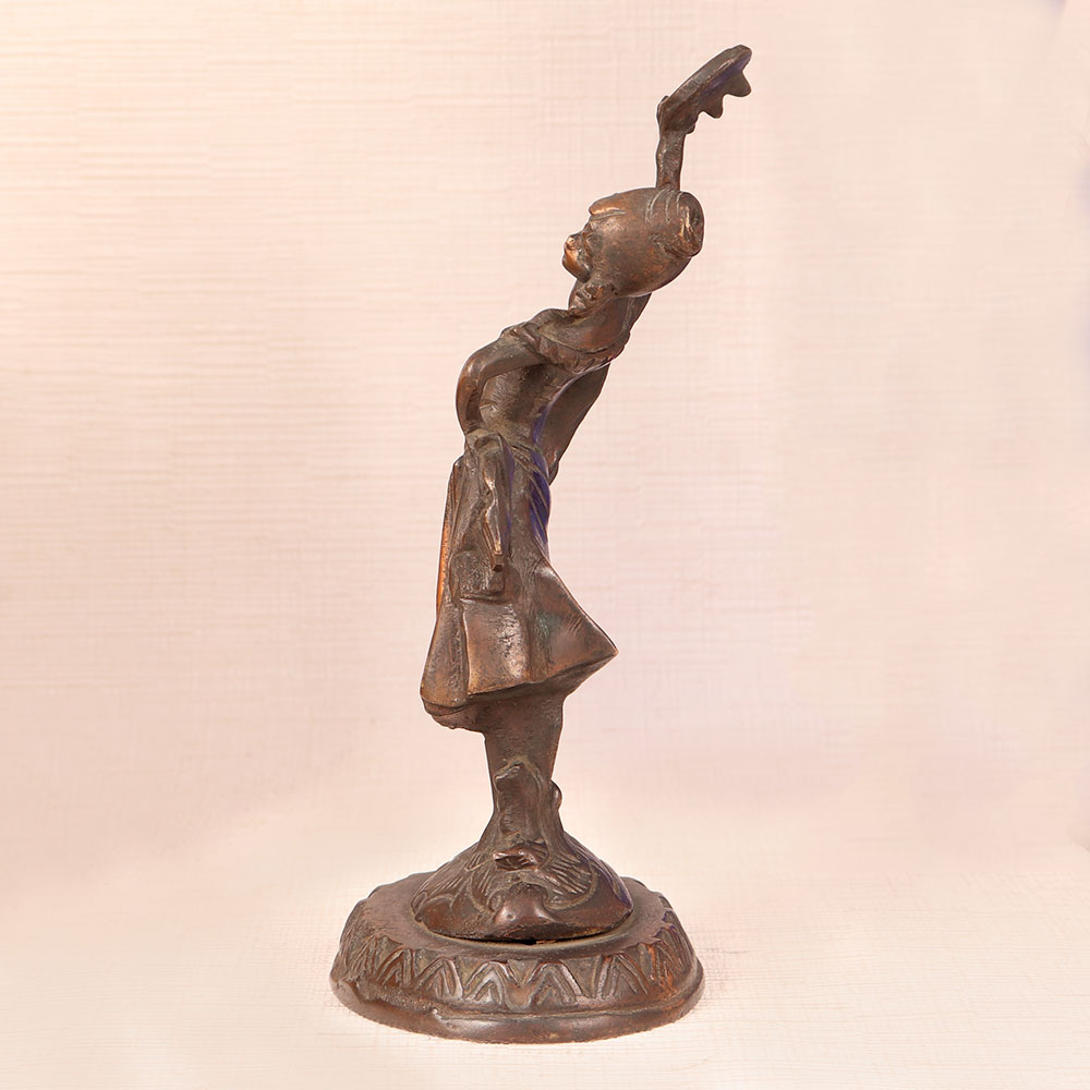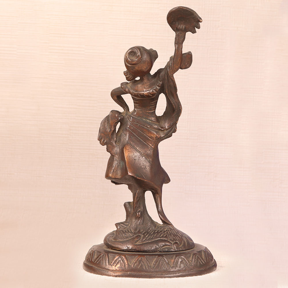This Vintage Brass Lady Statue is a captivating piece of artistry crafted in the English Art tradition. Handmade by highly skilled and experienced artisans with meticulous attention to detail, this masterpiece showcases a timeless charm that transcends eras. Bathed in an antique brown finish, it exudes warmth and nostalgia, adding a touch of vintage sophistication to any space. Made from high-quality brass, this exquisite lady stands frozen in a graceful pose, her contours capturing the essence of a bygone era. Versatile in its placement, it seamlessly complements the ambiance of homes, offices, restaurants, hotels, shops, or cafes, enhancing their aesthetic allure. A treasure for vintage collectors, this statue is equally perfect for exhibition displays, where it can transport viewers to the romanticism of yesteryears. Furthermore, it makes for an ideal gift to express your love and thoughtfulness on special, festive, or auspicious occasions, leaving a lasting impression on your family, friends or relatives. Embrace the allure of vintage charm with this timeless masterpiece.