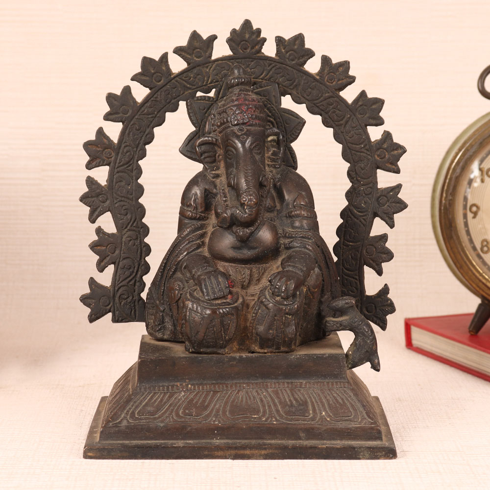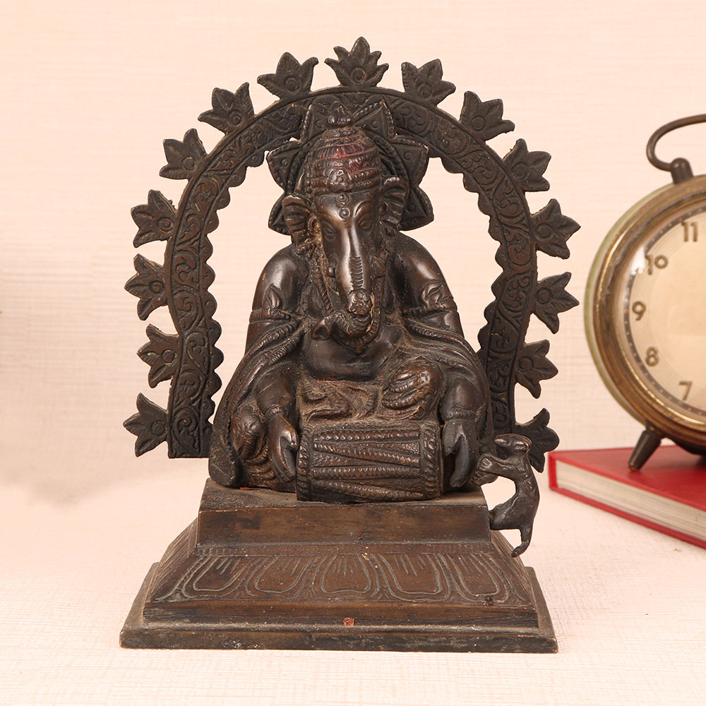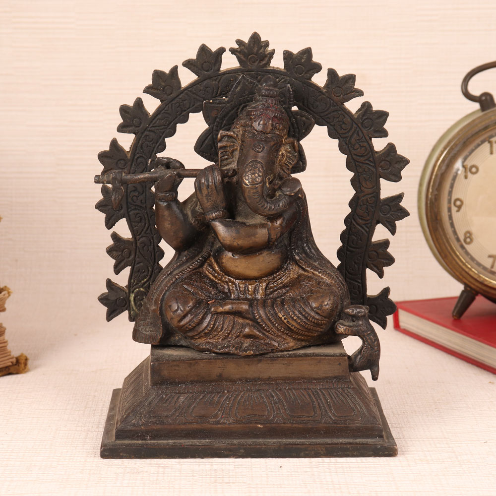 A set of four exquisite vintage brass statues, each portraying Lord Ganesha in a unique musical avatar. Crafted with precision by talented Indian artisans, these statues stand as a testament to the rich cultural heritage and craftsmanship of India. Cast in high-quality brass and finished in an antique brown patina, they exude an aura of timeless elegance. Lord Ganesha, the beloved Hindu deity known as the remover of obstacles and the patron of arts and sciences, is depicted here in four distinct forms, playing different musical instruments. These statues capture the essence of divine creativity, with Ganesha gracefully playing bongo drums, tapping a Indian Drum, blowing a flute, and playing tambourine. This remarkable set is versatile, making it suitable for a variety of settings. Whether adorning your home, office, restaurant, hotel, shop, cafe, or prayer room, these statues bring an air of spirituality and artistic grace to any space. They are ideal for collectors of vintage treasures, as well as for showcasing at exhibitions. Moreover, these statues make for a thoughtful and meaningful gift. Share the blessings of Lord Ganesha with your family, friends or relatives on special, festive, or auspicious occasions. Celebrate the fusion of art, spirituality, and culture with these magnificent vintage brass Ganesha statues, a true embodiment of divine harmony.