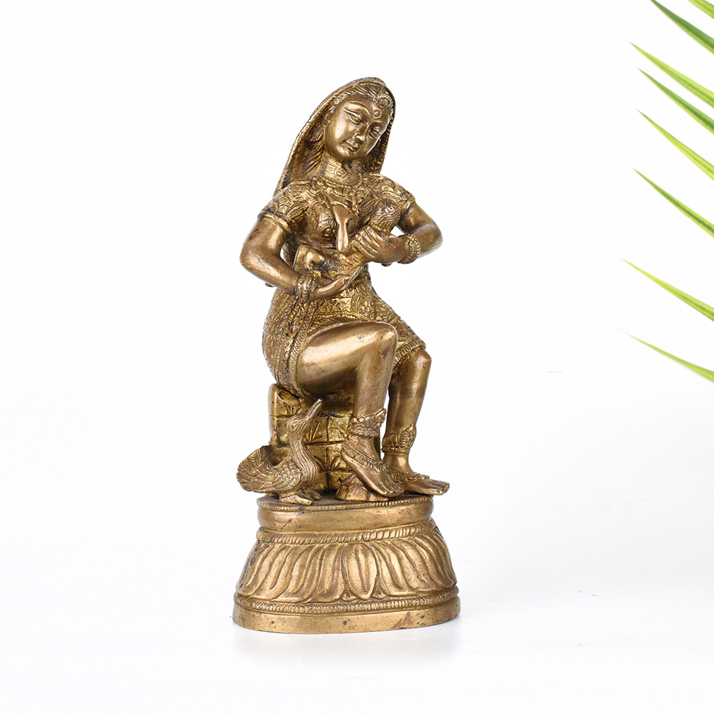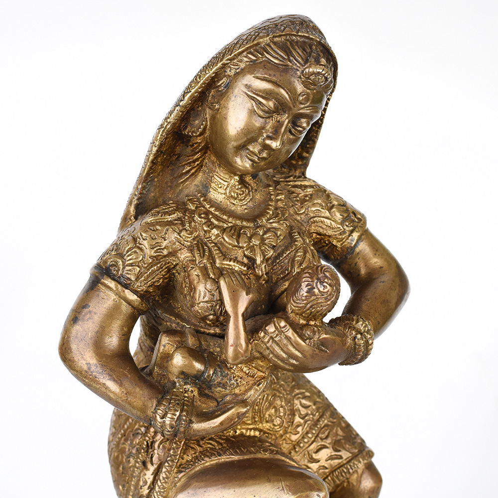 Elevate your spiritual practice with this exquisite vintage brass statue depicting the mother of Lord Krishna tenderly feeding her divine son. Crafted with the utmost attention to detail, this statue is a stunning work of art that will captivate all who behold it. This breathtaking statue invites you to experience the depth of a mother's love and devotion. As you gaze upon the tender moment between Krishna and his mother, you'll be transported to a realm of profound spiritual nourishment and reverence. Display this statue in your prayer room or meditation space to cultivate a sense of inner peace, connection, and divine inspiration. It also makes a cherished gift for Hindu holidays, housewarming celebrations, or to honor important milestones in loved ones' lives. Bring the sacred into your home and let this statue be a constant reminder of the power of love, devotion, and the divine.
