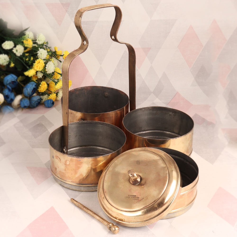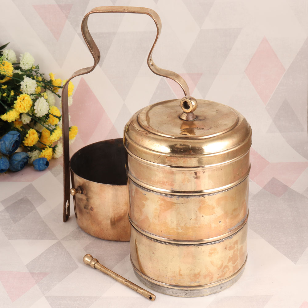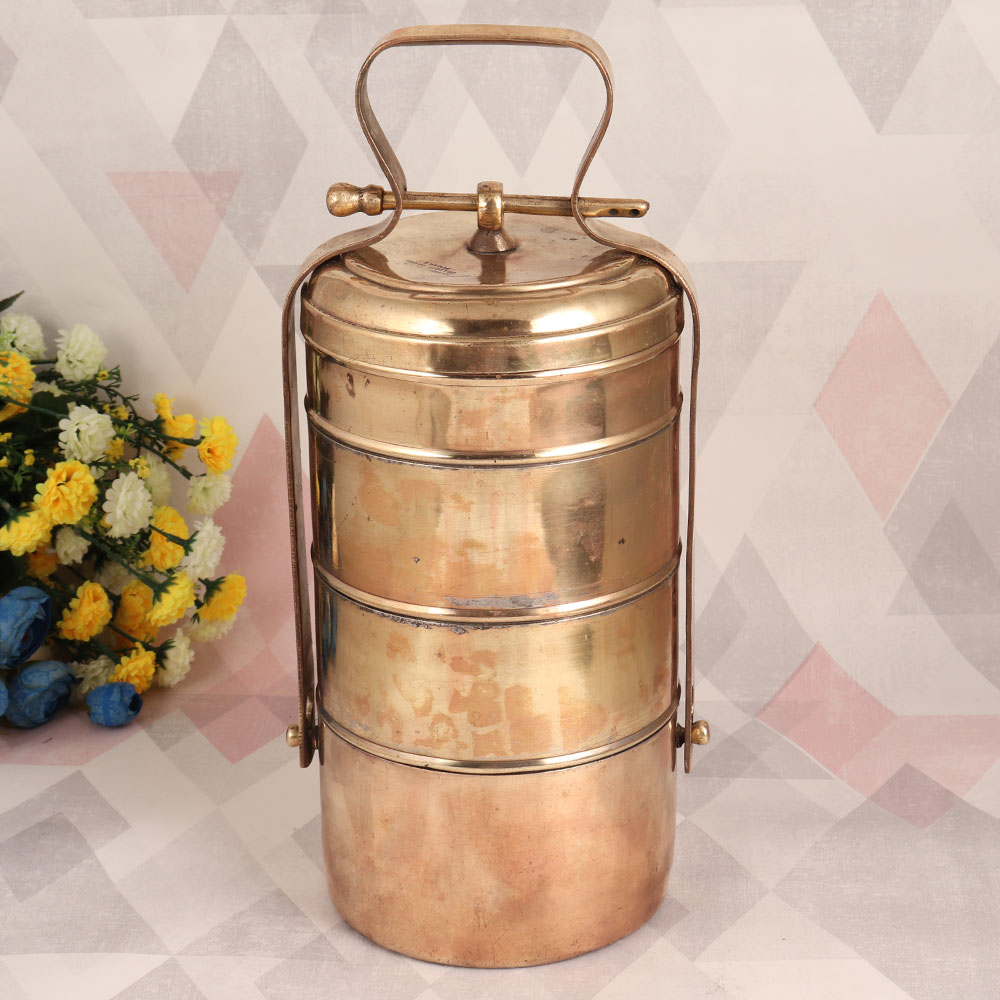 Buy an Antique Brown Brass Tiffin Box online and get a hassle free delivery at your doorstep. Handcrafted by highly skilled Indian artisans from premium-quality brass, this piece showcases a rich history and unparalleled craftsmanship. Originally designed as a functional tiffin box, this vintage treasure now serves as a captivating decorative accent. The antique brown finish exudes an aura of elegance, while the intricate lock mechanism adds an authentic touch of nostalgia. With its four compartments, it stands as a testament to the artistry of a bygone era. Perfect for enhancing the ambiance of your home, office, restaurant, hotel, or cafe, this antique brass tiffin box exudes an air of sophistication. Its versatile design allows it to seamlessly blend with various decor styles, making it a striking conversation piece wherever it's placed. Ideal for special, festive, or auspicious occasions, this antique brass tiffin box also makes for a thoughtful and meaningful gift. Share the beauty of Indian craftsmanship and history with your family, friends or relatives, as they too appreciate the allure of this vintage masterpiece. Embrace the past while adding a touch of elegance to your present with this exceptional brass tiffin box.