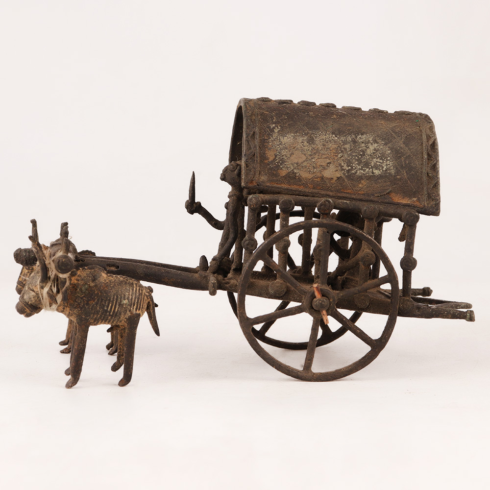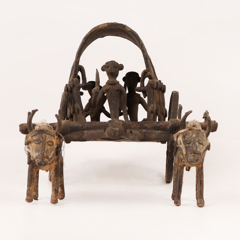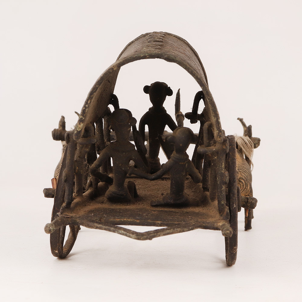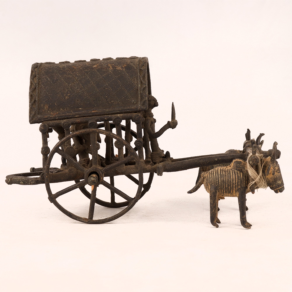 This Vintage Brass Tribal Chariot Statue is a magnificent piece of art that exudes timeless charm and cultural significance. Crafted from finest-quality brass and handcrafted by highly skilled and experienced Indian artisans, this stunning masterpiece showcases a tribal chariot adorned with intricate detailing and an enchanting antique finish. At its helm stands a skilled charioteer, guiding the two majestic bulls with precision and grace. Inside the chariot, two exquisitely carved figures add a touch of elegance and narrative to the scene. This statue's rich historical symbolism makes it a perfect addition to your home, office, restaurant, hotel, cafe, or shop, adding a touch of heritage and grace to any space. This remarkable artwork is versatile and can be showcased at exhibitions or museums, where its cultural significance will be appreciated by art enthusiasts and history lovers alike. For avid collectors of vintage items, this Tribal Chariot Statue becomes a prized gem in their esteemed collection. Furthermore, its aesthetic appeal and cultural essence make it an ideal gift for your loved ones on special or festive occasions, conveying your thoughtfulness and appreciation for their artistic sensibilities. Embrace the allure of history and tradition with this Vintage Brass Tribal Chariot Statue that beautifully blends artistry, heritage, and fine craftsmanship into one extraordinary piece.