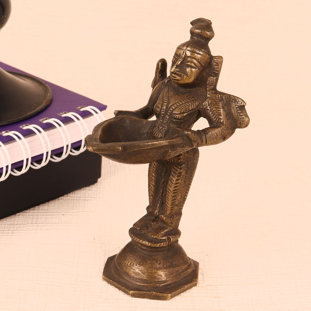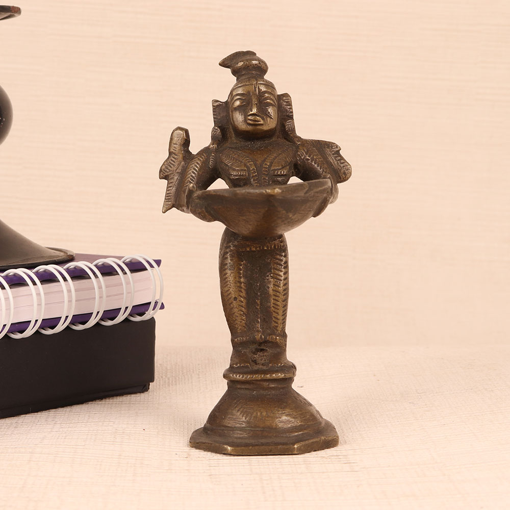 Buy a DeepLaxmi Brass Statue online in a captivating vintage brown finish that is a masterpiece meticulously handcrafted by highly talented Indian artisans. Crafted from the finest quality brass, this statue exudes elegance and cultural richness, making it a cherished addition to your surroundings. Standing as a symbol of prosperity and divinity, DeepLaxmi, with her intricate detailing and graceful form, adds a touch of spiritual sanctity to any space. Whether it's your home, office, restaurant, hotel, cafe, or shop, this statue creates a serene ambiance, ideal for prayer rooms or as a captivating decorative piece. The Deep Lakshmi Brass Statue not only enhances the aesthetics of your environment but also brings positivity. Illuminate it with traditional mustard oil or ghee, using a cotton wick, to radiate a warm, inviting glow, symbolizing the dispelling of darkness and the ushering in of light and blessings. For collectors of vintage treasures, this statue is a must-have, blending tradition with timeless beauty. It also makes a thoughtful gift for your family, friends or relatives during special, festive, or auspicious occasions, conveying your heartfelt wishes for their prosperity and happiness. Embrace the enchanting aura of DeepLaxmi and let her grace your life with grace and positivity.