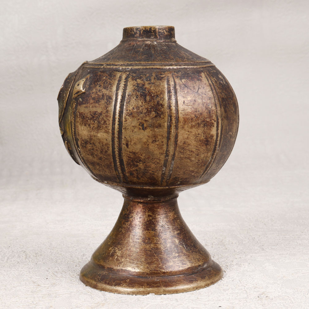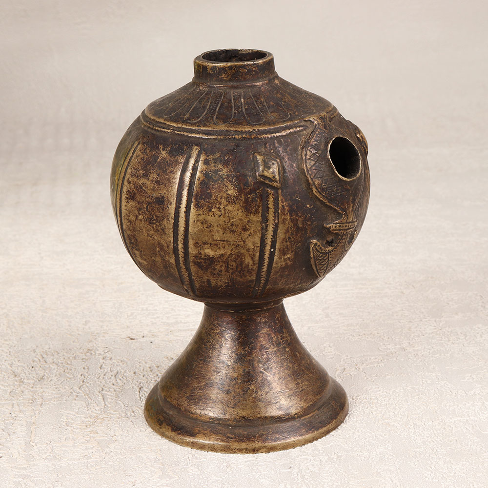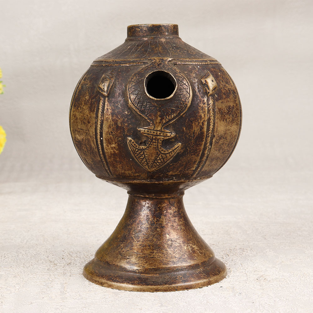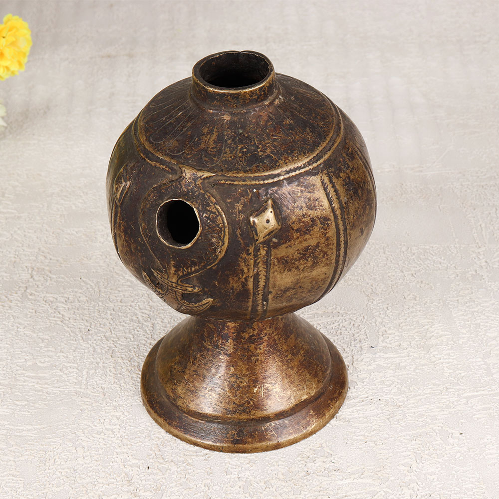 Indulge in the timeless allure of our Vintage Brass Hookah Base that is a masterpiece crafted by skilled Indian artisans in the age-old tradition of Himalayan Art. Meticulously handmade from high-quality brass, this exquisite piece boasts intricate engravings that tell tales of a bygone era. The antique brown finish adds a touch of nostalgia, creating a charming aesthetic that transcends time. Versatile in its application, this hookah base serves as a unique indoor flower pot, transforming any space with its old-world charm. Whether adorning the home, office, restaurant, hotel, or cafe, it exudes an air of sophistication and cultural richness. A perfect addition to any vintage collection, this piece is not just an item of decor but a cherished artefact. Celebrate special moments by gifting this Vintage Brass Hookah Base to your family, friends or relatives on occasions that are special, festive, or auspicious. Immerse yourself in the beauty of craftsmanship and history, as this piece effortlessly becomes a symbol of artistry, tradition, and the joy of sharing timeless treasures.