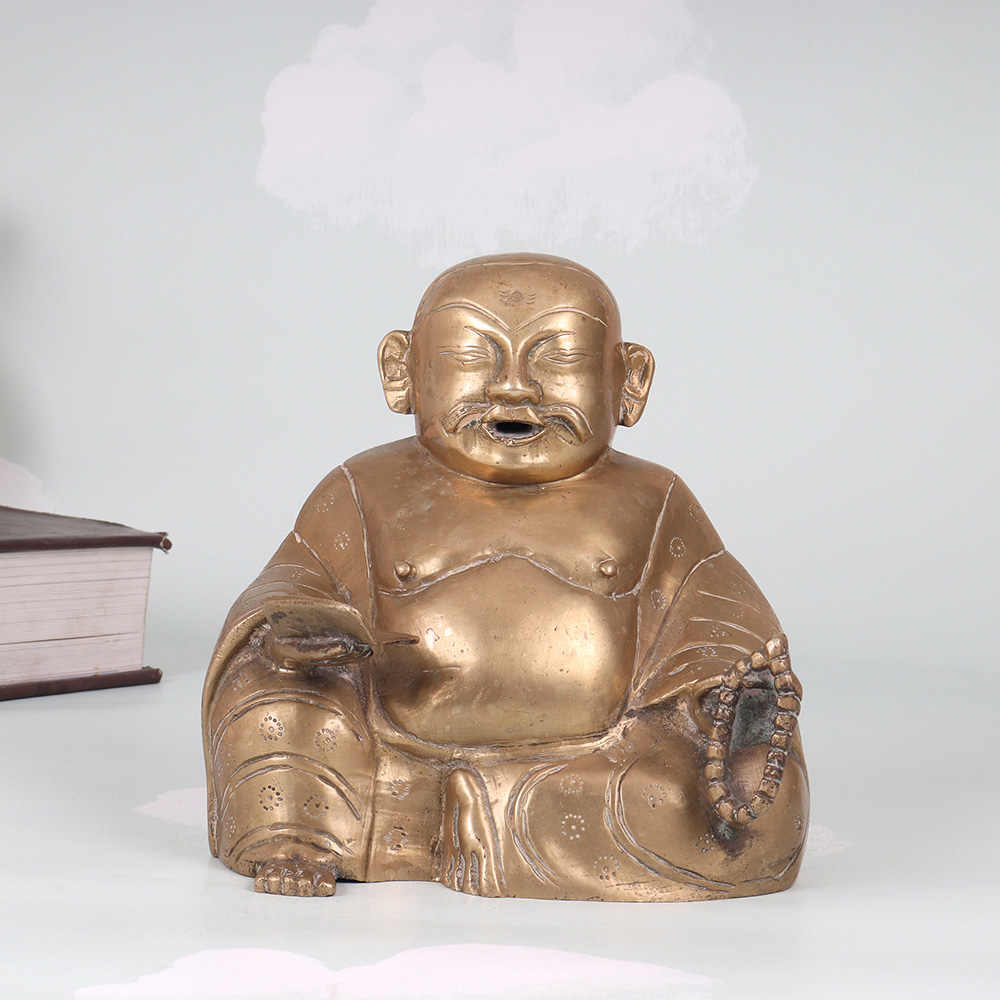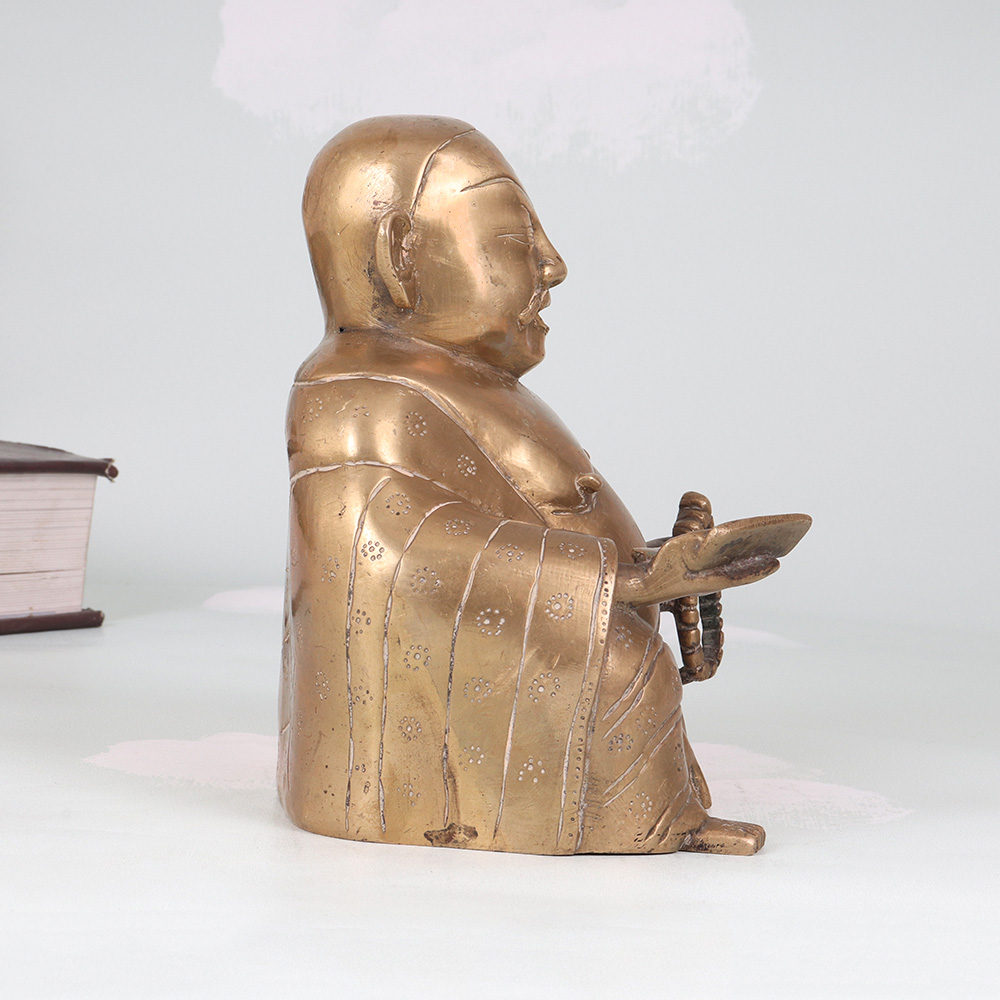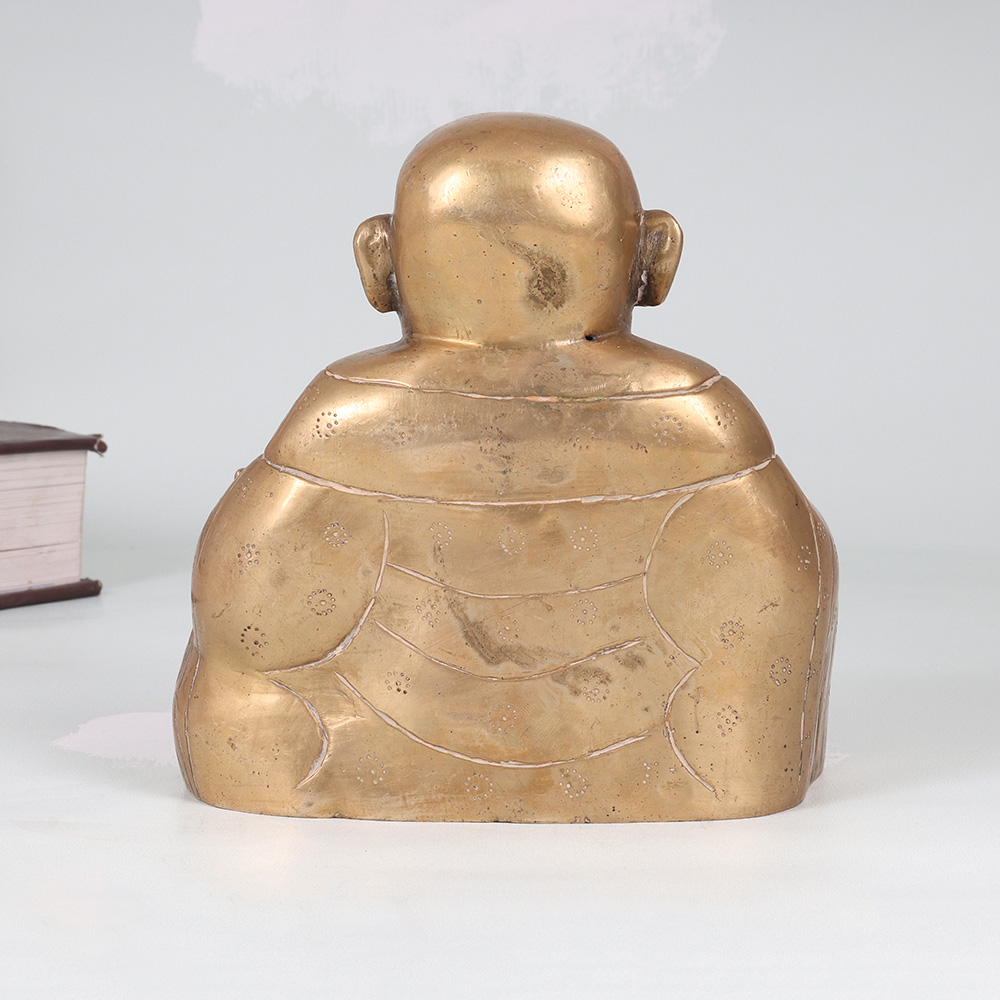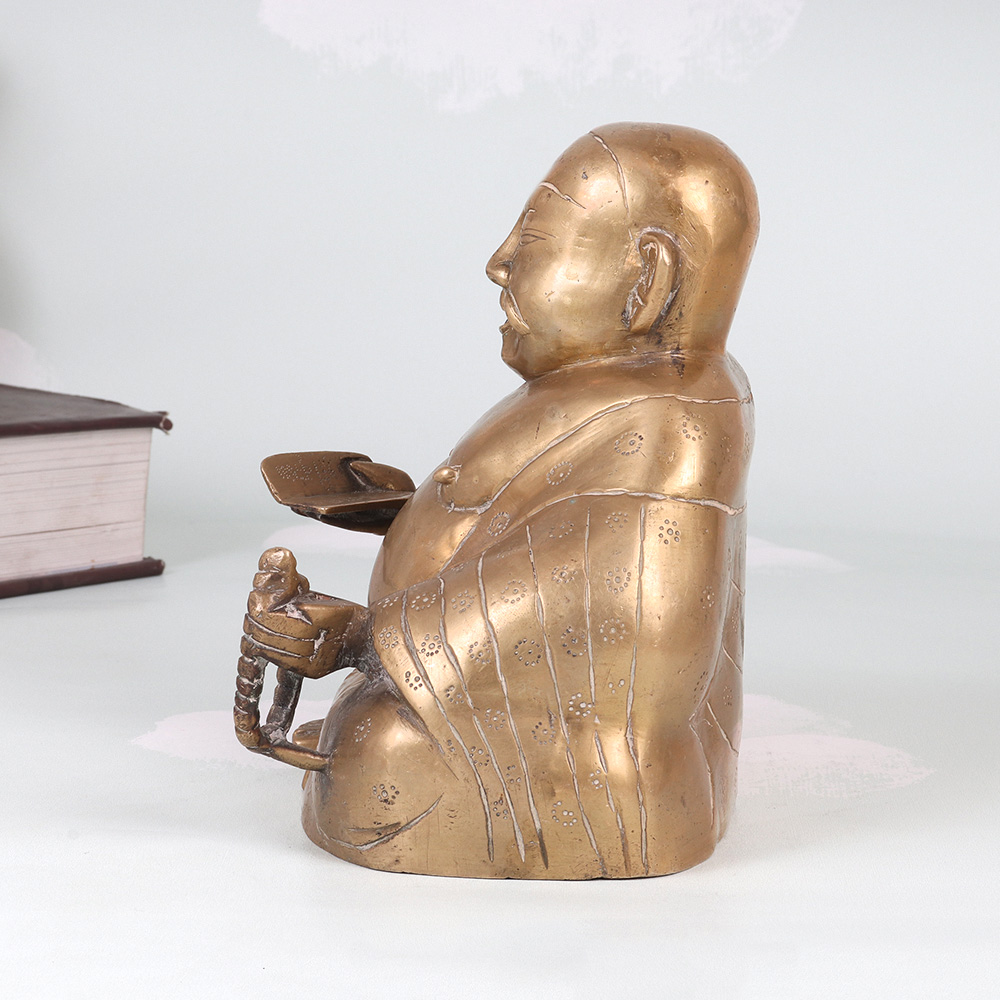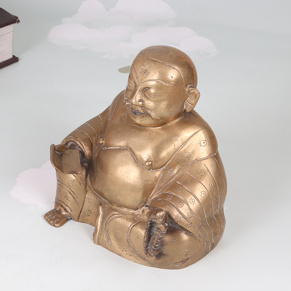 Radiate positive energy and invite prosperity into your home with this stunning vintage brass Laughing Buddha statue. Crafted with meticulous attention to detail, this captivating piece commands attention with its joyful expression and antique-inspired look. In Chinese culture, the Laughing Buddha is revered as an embodiment of contentment, generosity, and inner peace. Placing this magnificent statue in your home is said to attract wealth, luck, and laughter, infusing your surroundings with his joyful energy. This vintage brass Laughing Buddha is a true work of art that will elevate the ambiance of any room, from the living area to the office. Its impressive size and exquisite craftsmanship make it a captivating conversation piece that guests will admire. Display it proudly to bask in the Buddha's blessings of abundance and well-being.