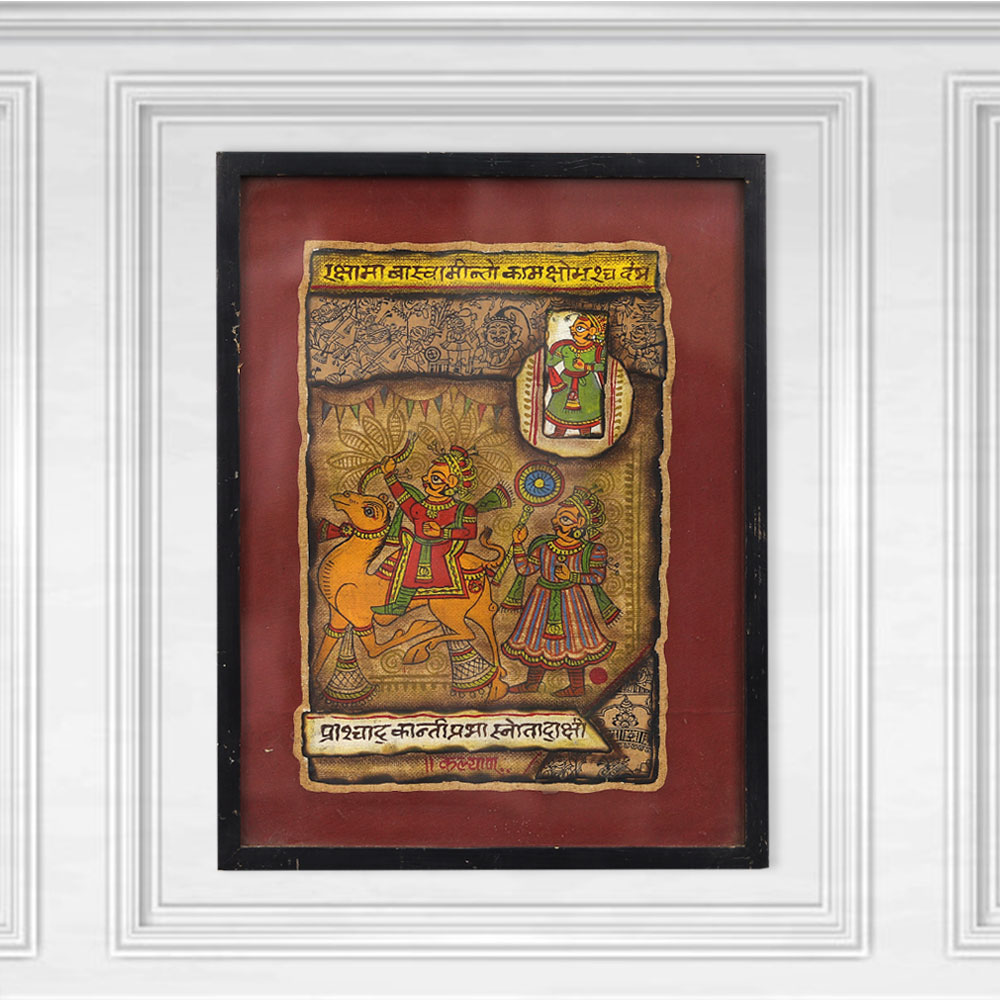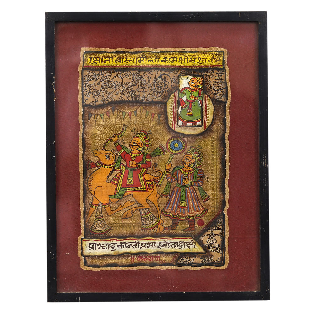 Elevate your walls with the timeless beauty of a Rajasthani bapu phad painting, now available as a stunning cloth wall hanging framed in rustic wood. The bapu phad painting tradition originated centuries ago in the village of Bhilwara, Rajasthan, where skilled artisans perfected the technique of creating these iconic textile masterpieces. Each one-of-a-kind piece tells a story of India's rich cultural heritage, with motifs and symbols that evoke the beauty of the Rajasthani landscape. Now, you can bring that timeless artistry into your own home. This cloth wall hanging effortlessly blends old-world charm with modern home decor, elevating any room with its captivating presence. Hang it in your living space, bedroom, or entryway to infuse your space with the warm, vibrant essence of Rajasthan. It's a truly unique way to showcase your appreciation for Indian craftsmanship and culture.