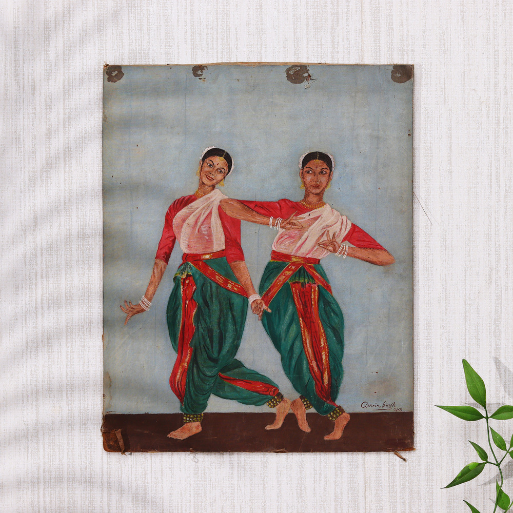 Experience the grace and elegance of India's renowned Bharatanatyam dance form with this stunning, vintage cloth painting. Showcasing the fluid movements and iconic poses of two skilled dancers, this exquisite work of art transports you to the heart of India's rich cultural heritage. Bharatanatyam is a captivating blend of precise footwork, expressive hand gestures, and captivating storytelling. This painting allows you to immerse yourself in the beauty and grace of this time-honored tradition, right in the comfort of your own home. Gaze upon the dancers as they seem to come alive, their movements flowing with a mesmerizing fluidity that will leave you in awe. Whether you're a lover of Indian art, an admirer of classical dance, or simply seeking to add a touch of exotic elegance to your space, this vintage Bharatanatyam painting is a true treasure. Hang it proudly and let it inspire you to explore the captivating world of Indian performing arts. This is a one-of-a-kind work of art that will elevate any room and captivate all who behold it.